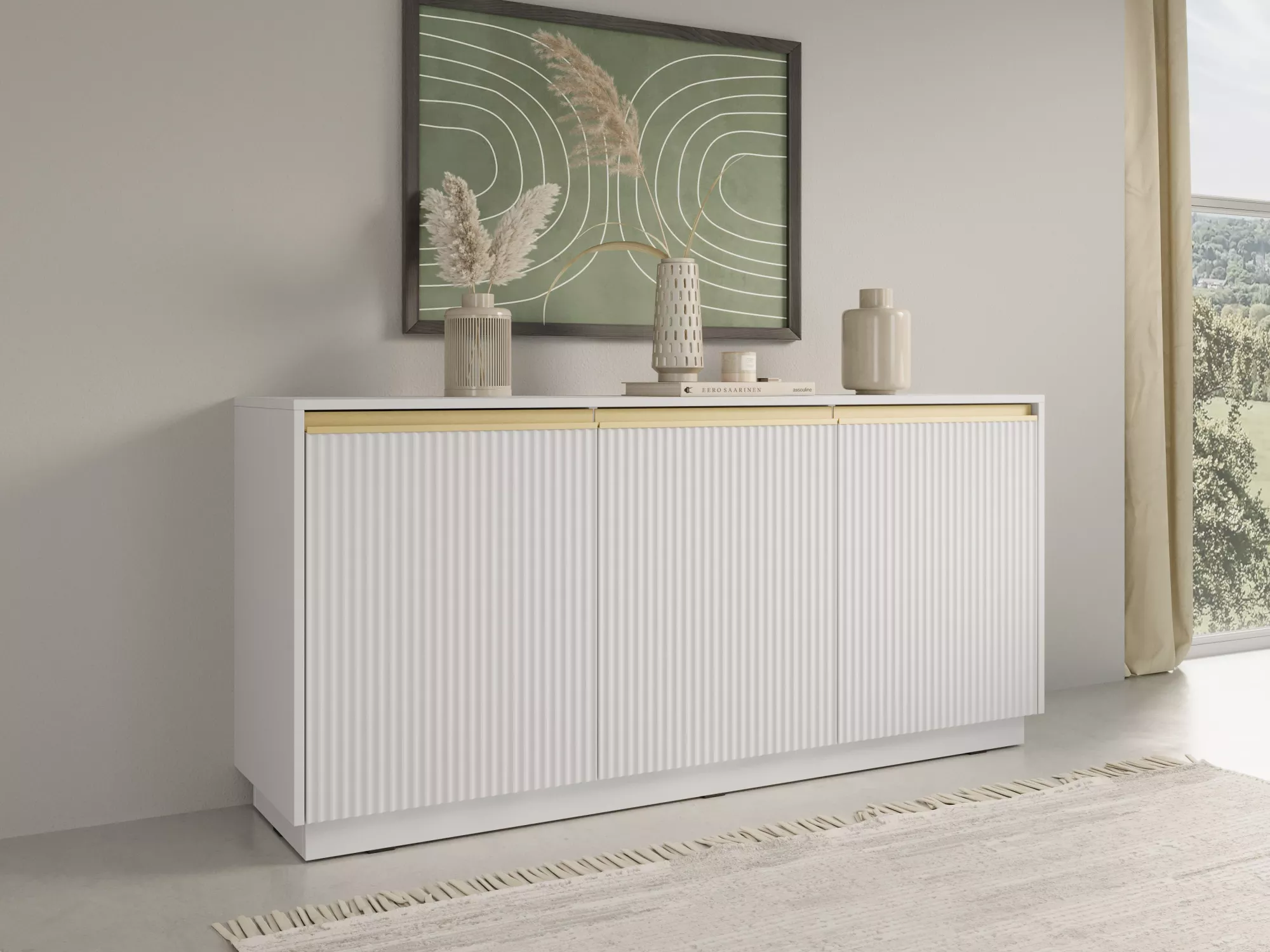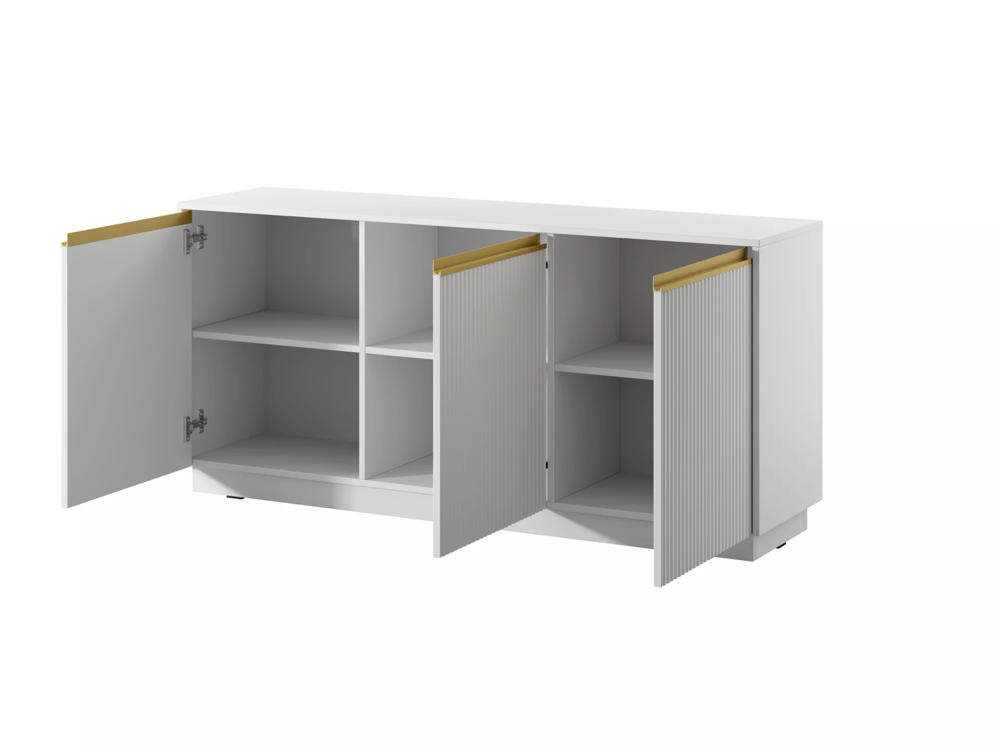 Široká komoda s policemi MANANA se vyznačuje jedinečným designem díky ozdobnému frézování. Hodí se do všech moderních obývacích pokojů, ložnice či předsíně. Disponuje 3 prostornými uzavřenými policemi.