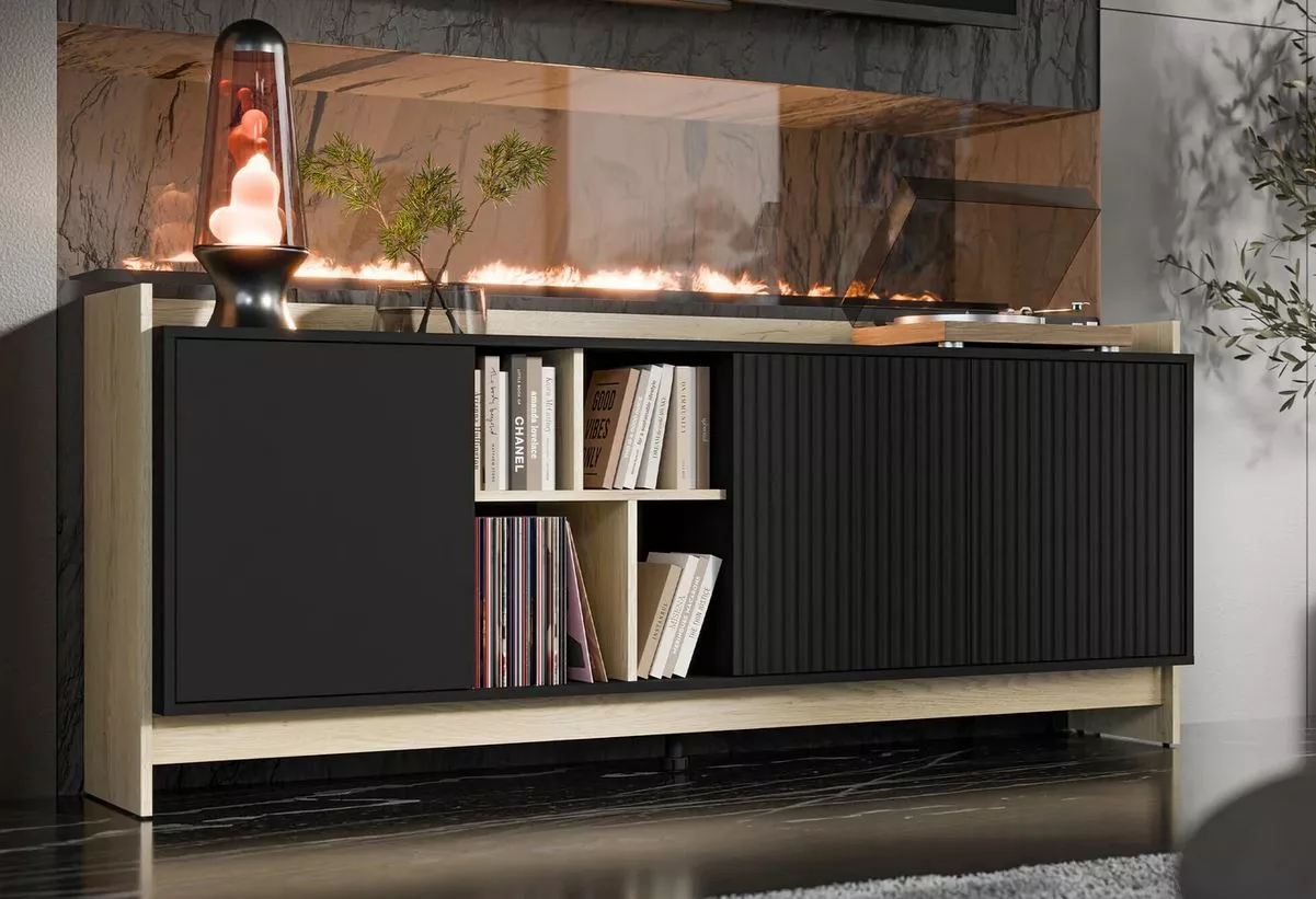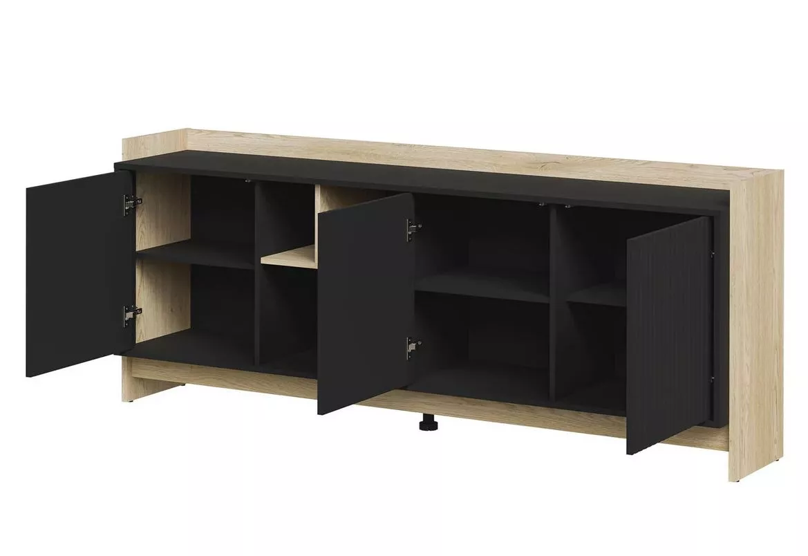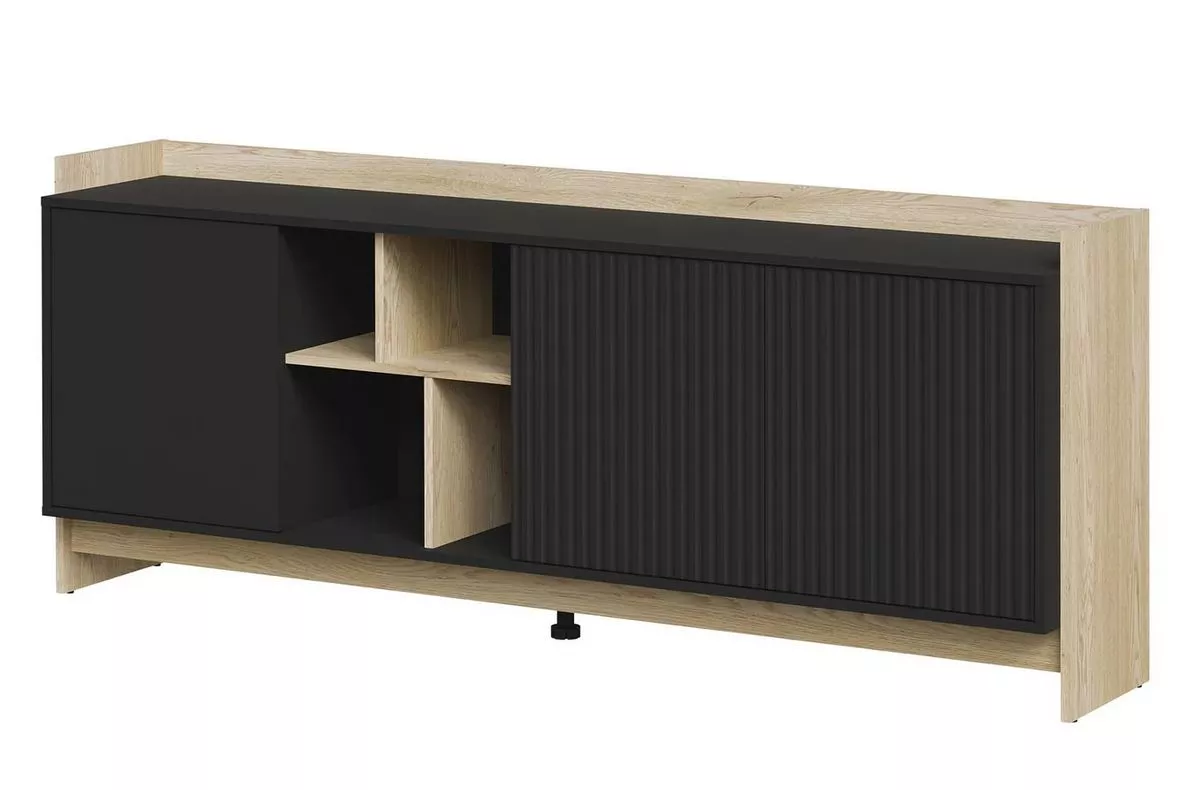 Stylová komoda ILOFA kombinuje praktičnost s moderním designem. Díky dvířkům a otevřeným policím nabízí dostatek úložného prostoru pro všechny vaše potřeby – od dekorací po každodenní nezbytnosti. Kombinace přírodního dekoru a matné černé barvy dodává komodě elegantní a nadčasový vzhled, který se snadno začlení do jakéhokoli interiéru. Skvělá volba pro ty, kteří hledají funkční a esteticky propracovaný nábytek.