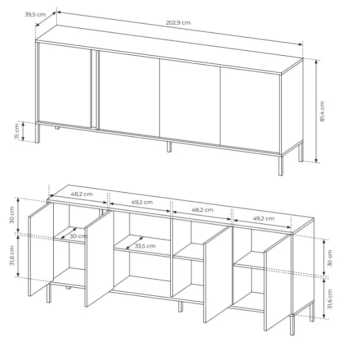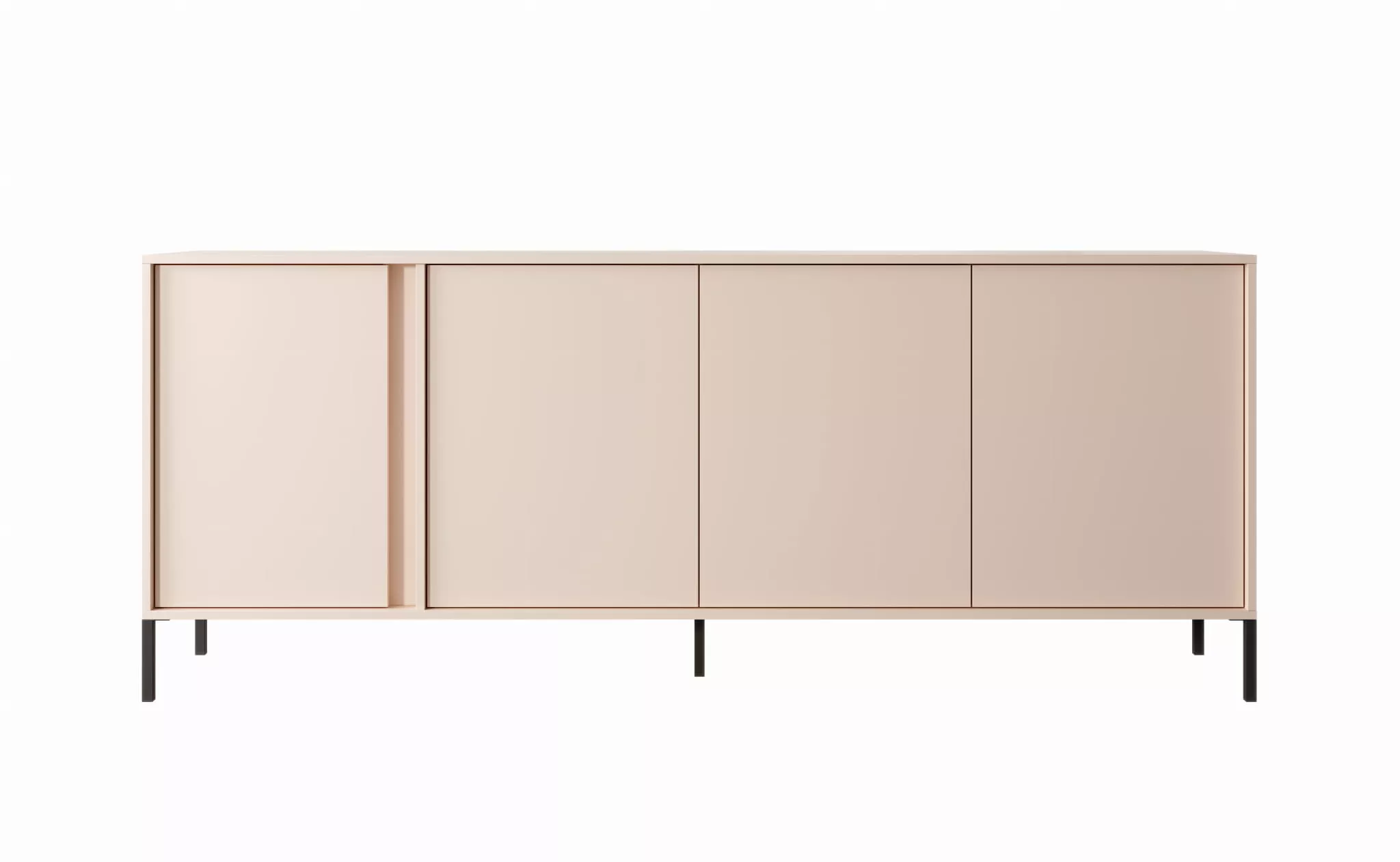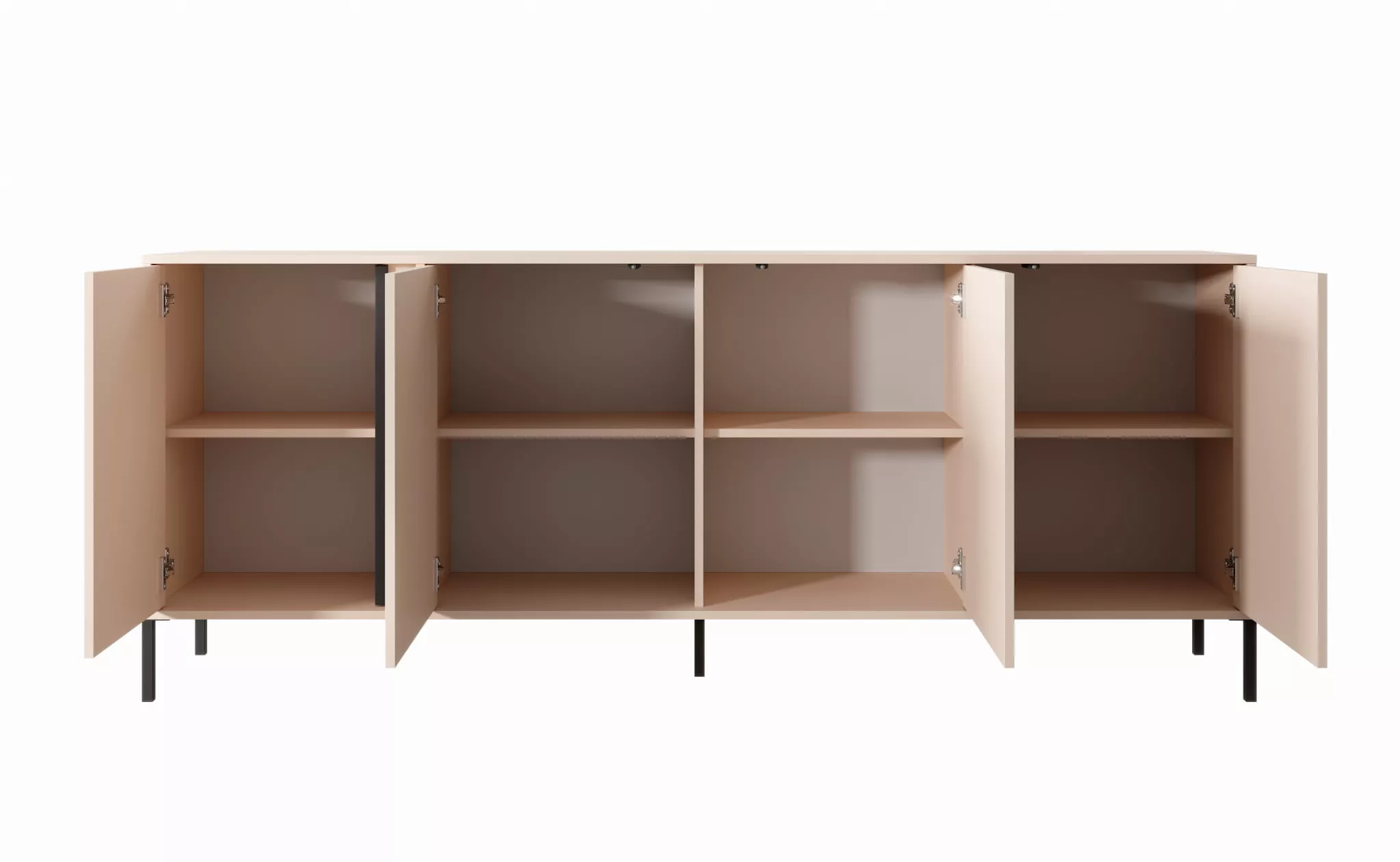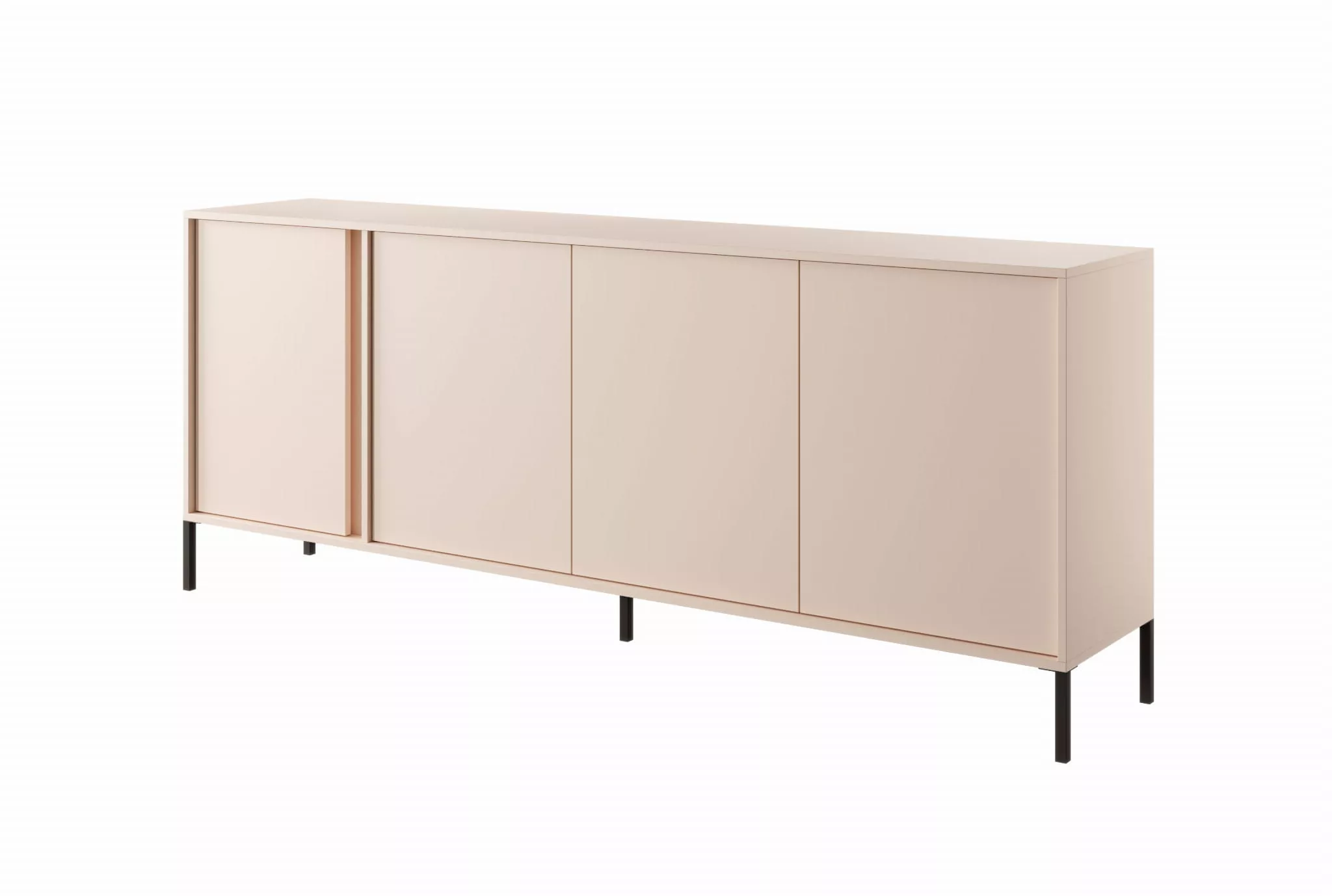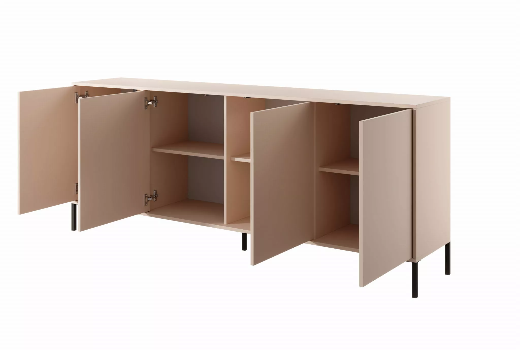 Široká komoda s dvířky SLOCOMB spojuje lehkost a eleganci. Kovové černé nožky dodávají komodě moderní nádech a stabilitu. Systém otevírání PUSH TO OPEN zajišťuje čistý a minimalistický vzhled bez úchytek, což komodu činí ještě elegantnější. SLOCOMB je ideálním kouskem pro každý interiér, kde se snoubí styl s praktičností.