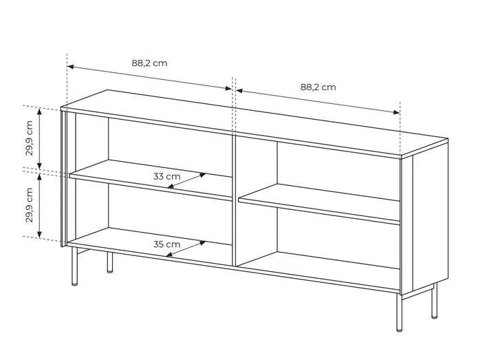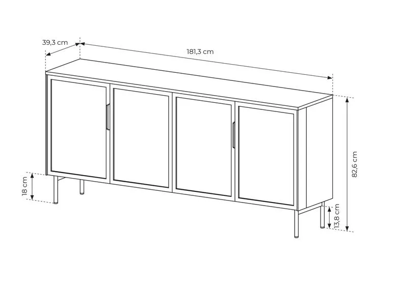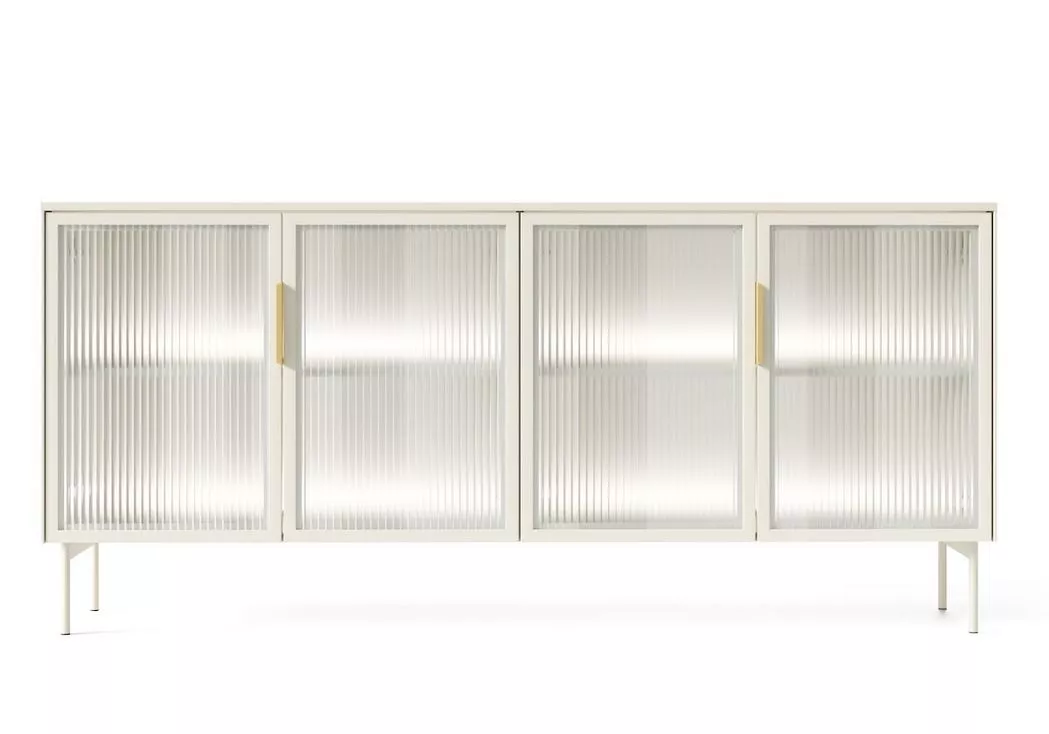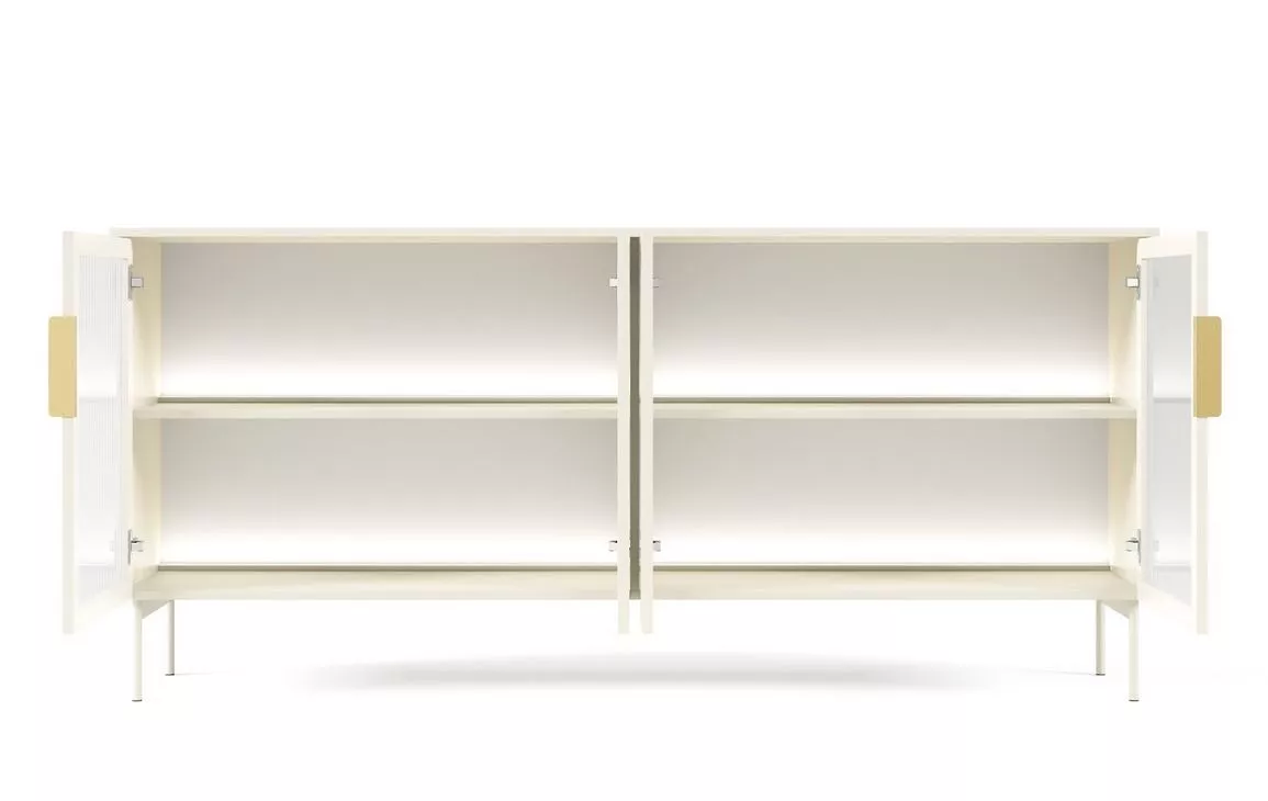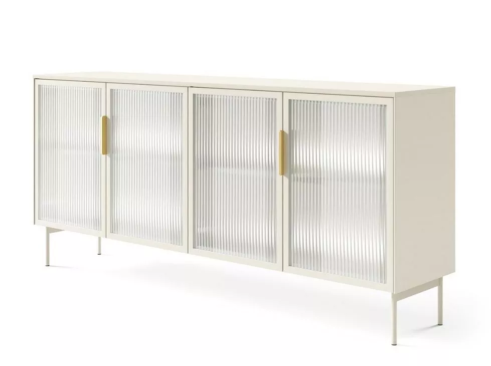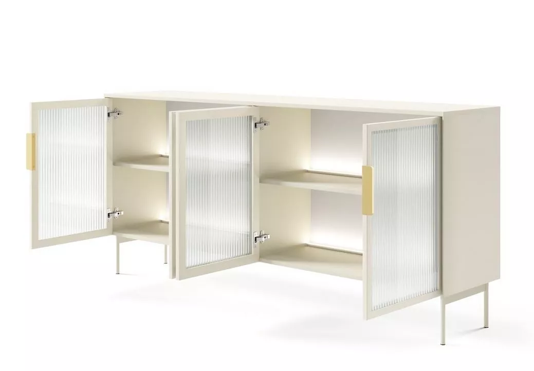 Vneste do interiéru šmrnc a eleganci s prosklenou širokou komodou SULIGENT. Hluboké police za ornamentálním sklem jsou ideální pro vystavení dekorací i praktických doplňků. Kovové zlaté úchyty a vysoké nožky dodávají nábytku luxusní nádech, zatímco LED osvětlení zvýrazní každý detail a navodí příjemnou atmosféru.