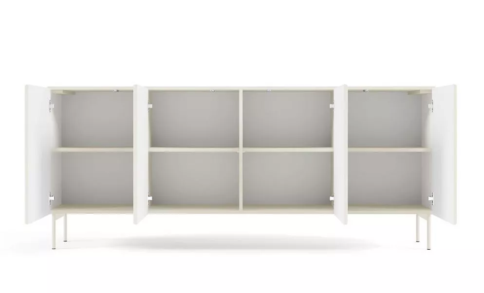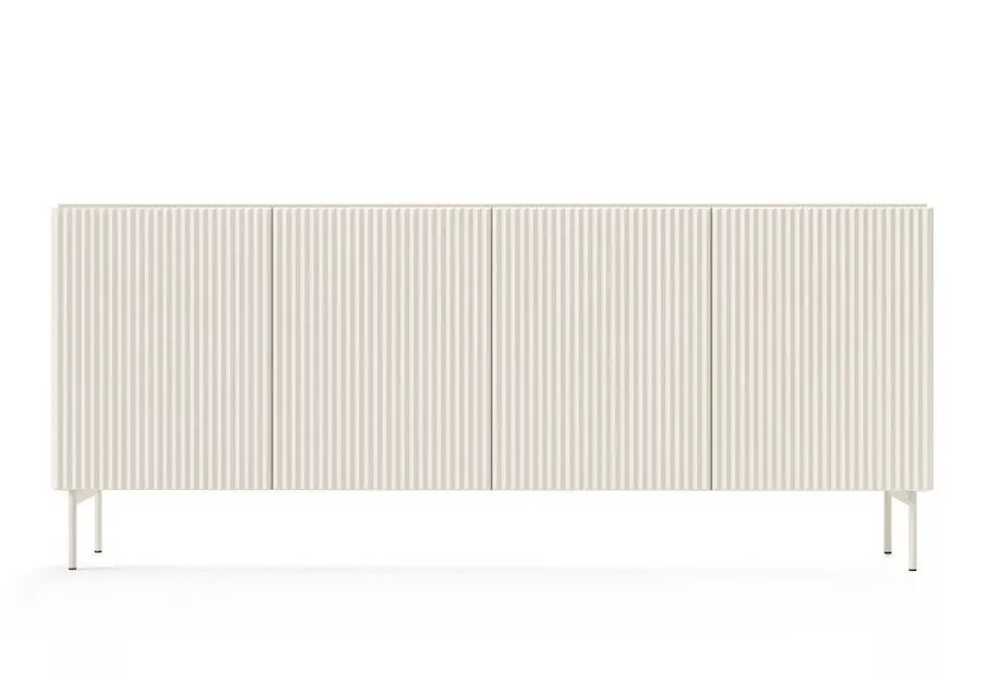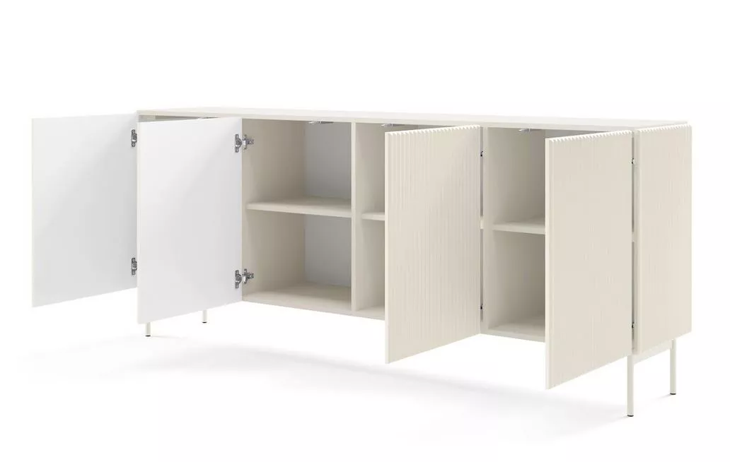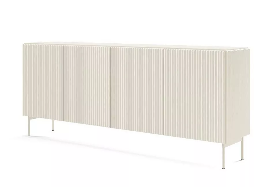 Vylepšete svůj interiér širokou komodou s dvířky BOAZ – harmonickým spojením moderní lehkosti a funkčnosti. Hluboké police poskytují dostatek úložného prostoru, zatímco bezúchytková čela s jemným drážkováním dodávají nábytku charakter i vizuální rytmus. Rovné kovové nožky doplňují celý vzhled a podtrhují nadčasový styl komody inspirovaný nejnovějšími trendy.