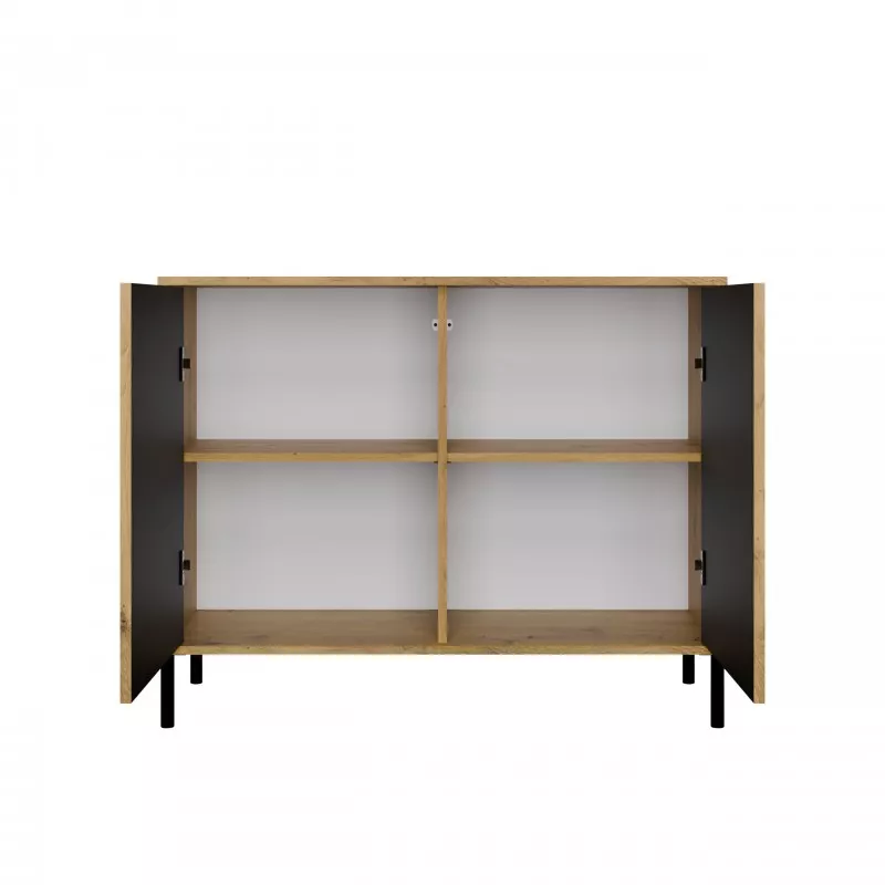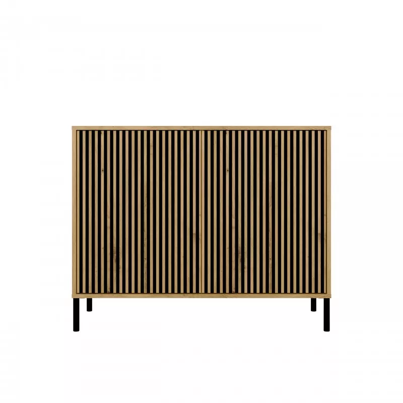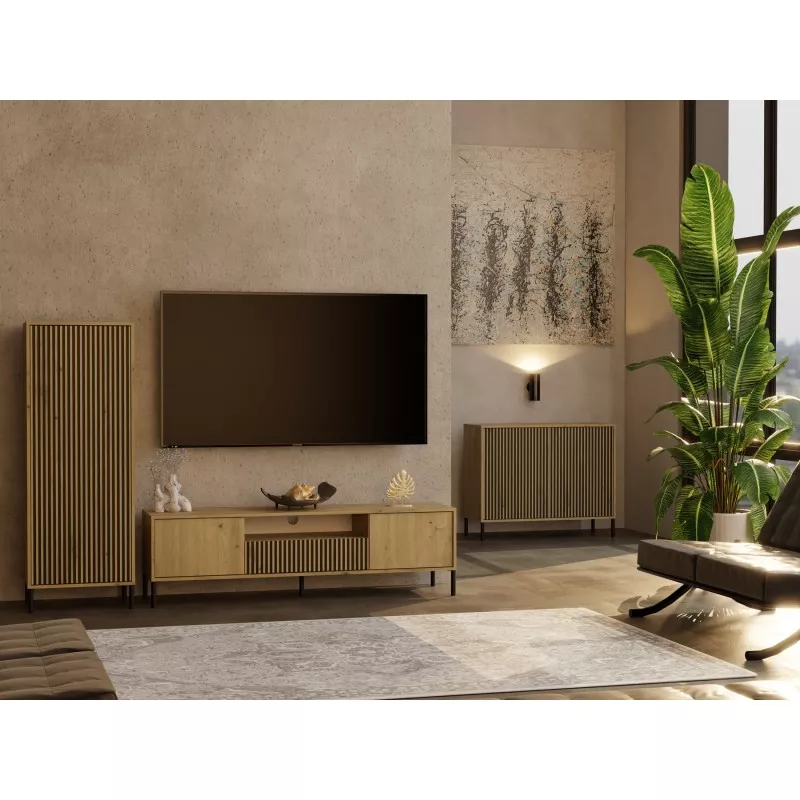 Objevte komodu ELBA s drážkovanými dvířky, která dodá interiéru industriální šmrnc. Díky systému TIP-ON otevřete dvířka jen lehkým dotykem – bez zbytečných úchytů. Čtyři prostorné police skryjí vše potřebné a udrží váš domov krásně uspořádaný.