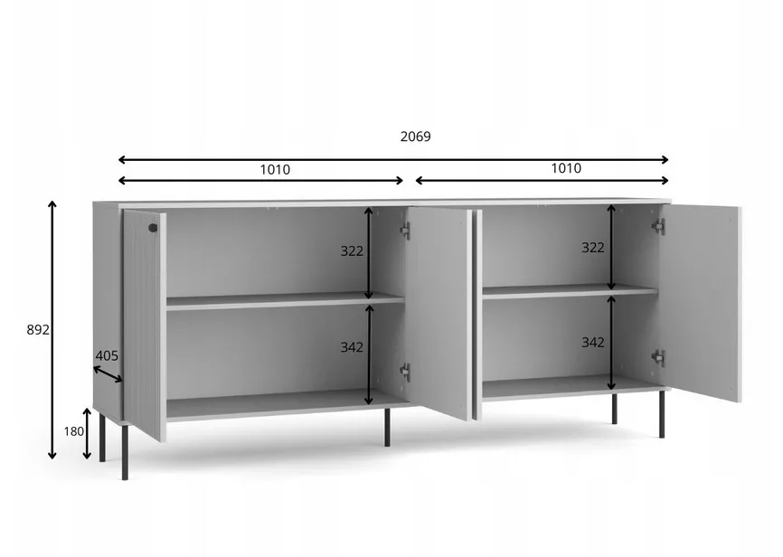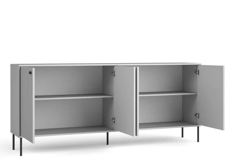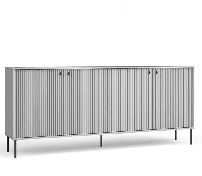 Objevte širokou komodu s dvířky MALAMBO, která vnese do prostoru klid a harmonii díky své módní šedé barvě. Uzavřené skříňky nabízí praktické a přehledné úložné řešení. Jemně drážkovaná dvířka dodávají komodě elegantní texturu a charakter.