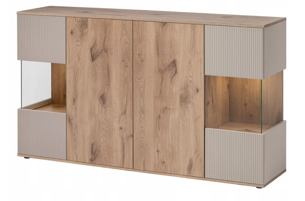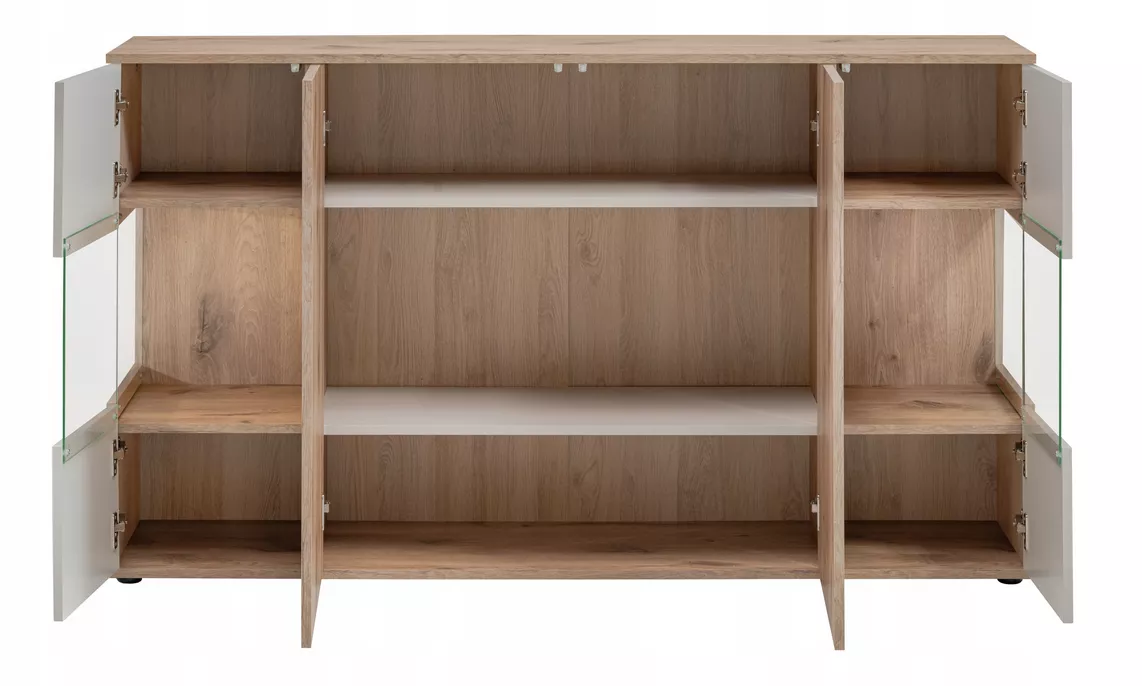 Široká komoda HAIKA kombinuje eleganci s praktičností. Uvnitř komody jsou police.