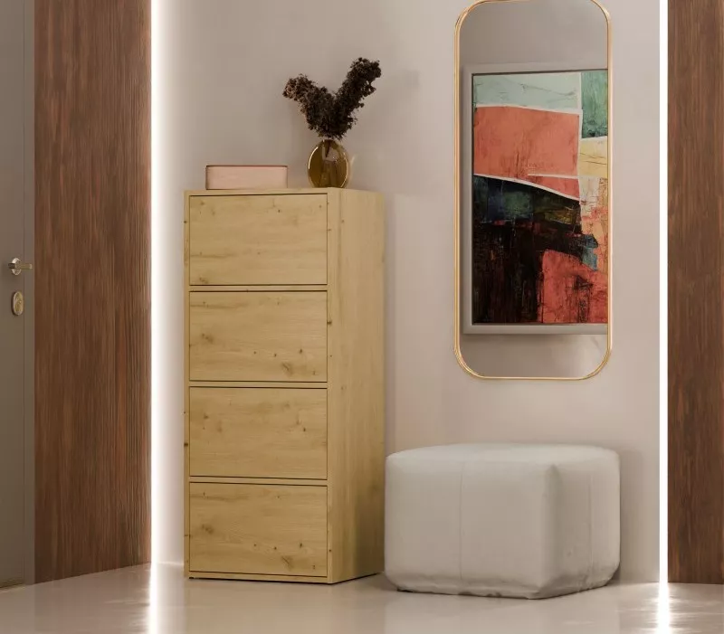 Úzká komoda s dvířky ATALLA vyniká čistými liniemi a minimalistickým vzhledem. Komoda nabízí dostatek prostoru pro uložení všech potřebných věcí. Dvířka mají systém otevírání TIP-ON, což zpříjemňuje každodenní používání.