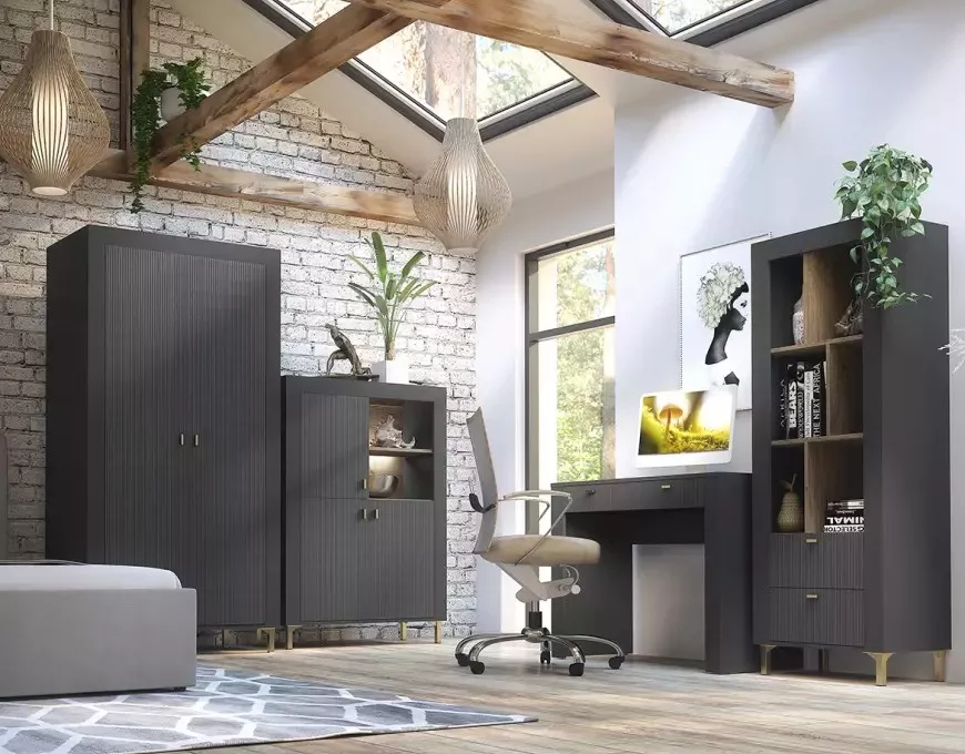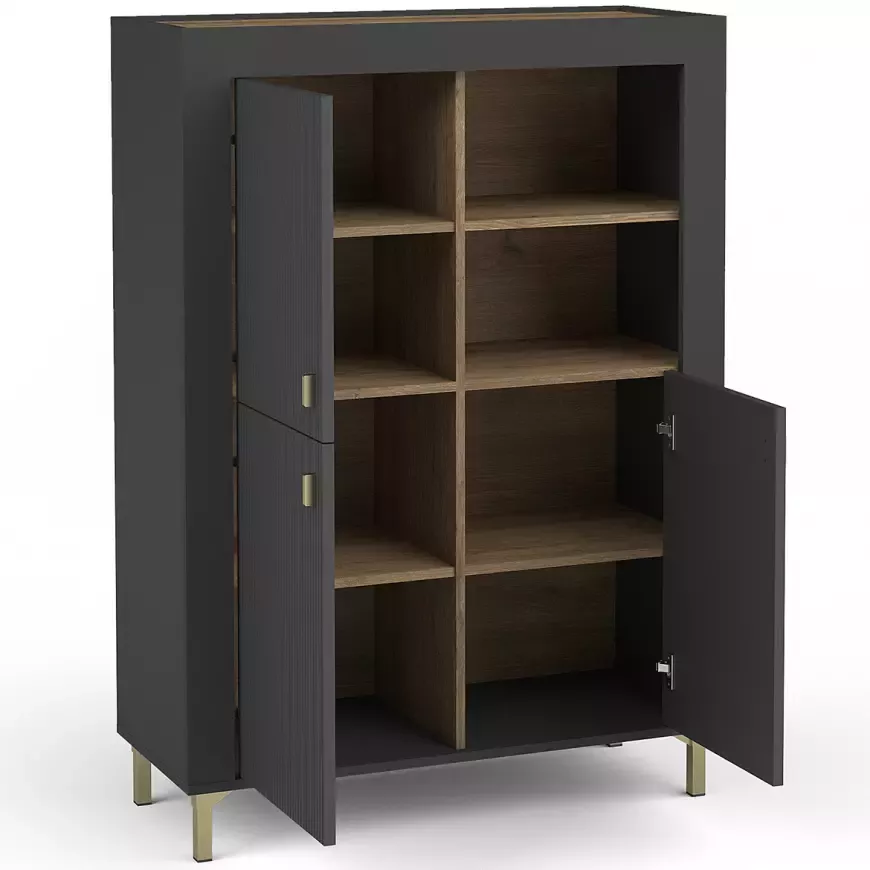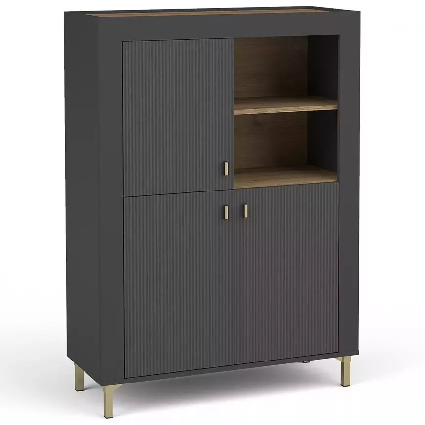 Úzká komoda s dvířky AUROVA spojuje praktičnost s vytříbeným stylem. Uzavřené skříňky a otevřené police nabídnou prostor pro dekorace a vše, co má zůstat schované. Drážkovaná čela přidávají jemný a elegantní akcent, který zaujme na první pohled.