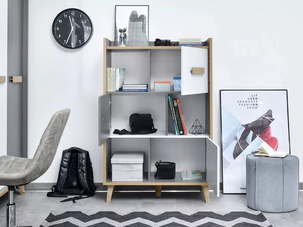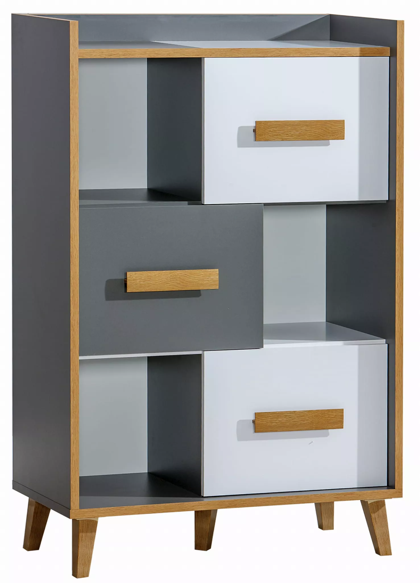 Komoda s dvířky DOBSON je postavená na pevných nohou, které komodě zajišťují stabilitu. Disponuje 3 otevřenými přihrádkami a 3 přihrádkami s dvířky. Komoda skvěle zapadne do každého studentského nebo dětského pokoje.