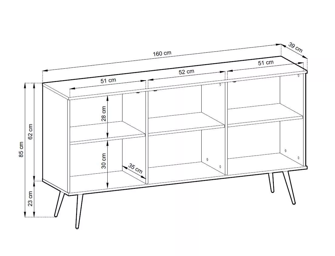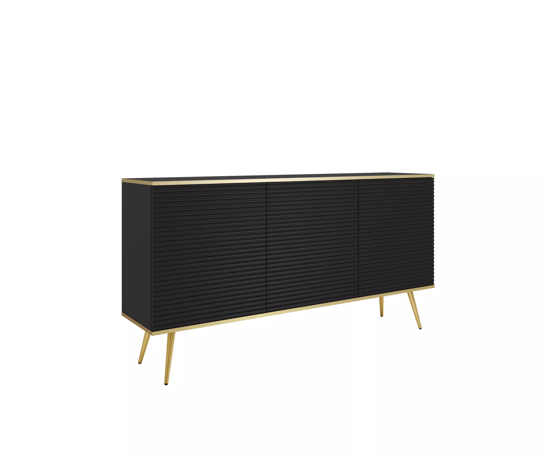 Široká komoda s dvířky JENY 2 zaujme svými drážkovanými čely dvířek a zlatými detaily. Je vybavená 3 prostornými skříňkami s dostatkem úložného prostoru. Vysoké kovové nožky dodávají komodě stabilitu a pevnost.