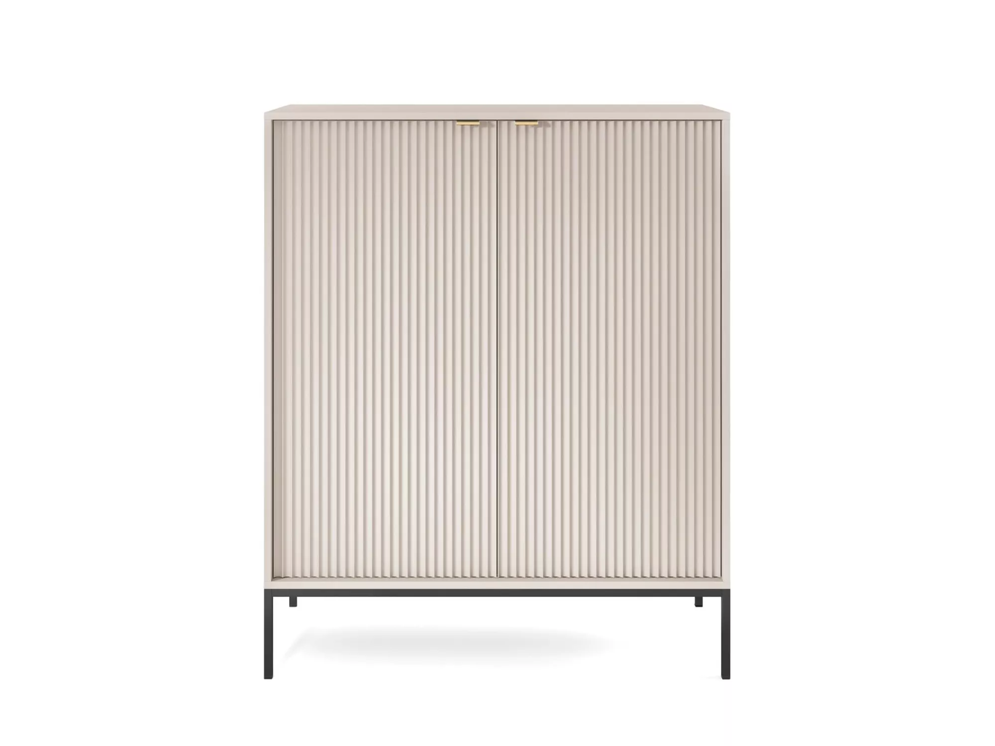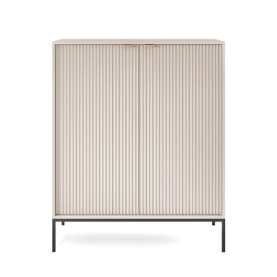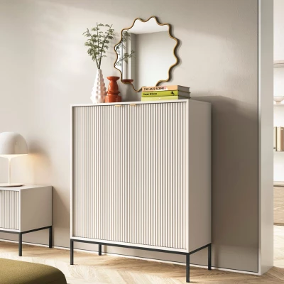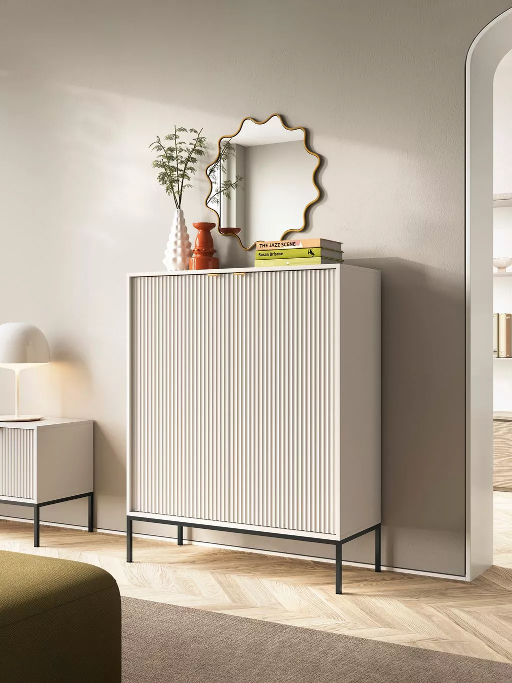 Vysoká komoda MISHEEL uchvátí především svým originálním a nadčasovým designem v podobě drážkovaných předních částí dvířek. Skvěle zapadne do obývacích pokojů nebo ložnic. Disponuje 2 skříňkami s policemi pro snadné uschování předmětů.