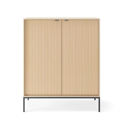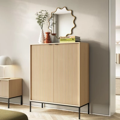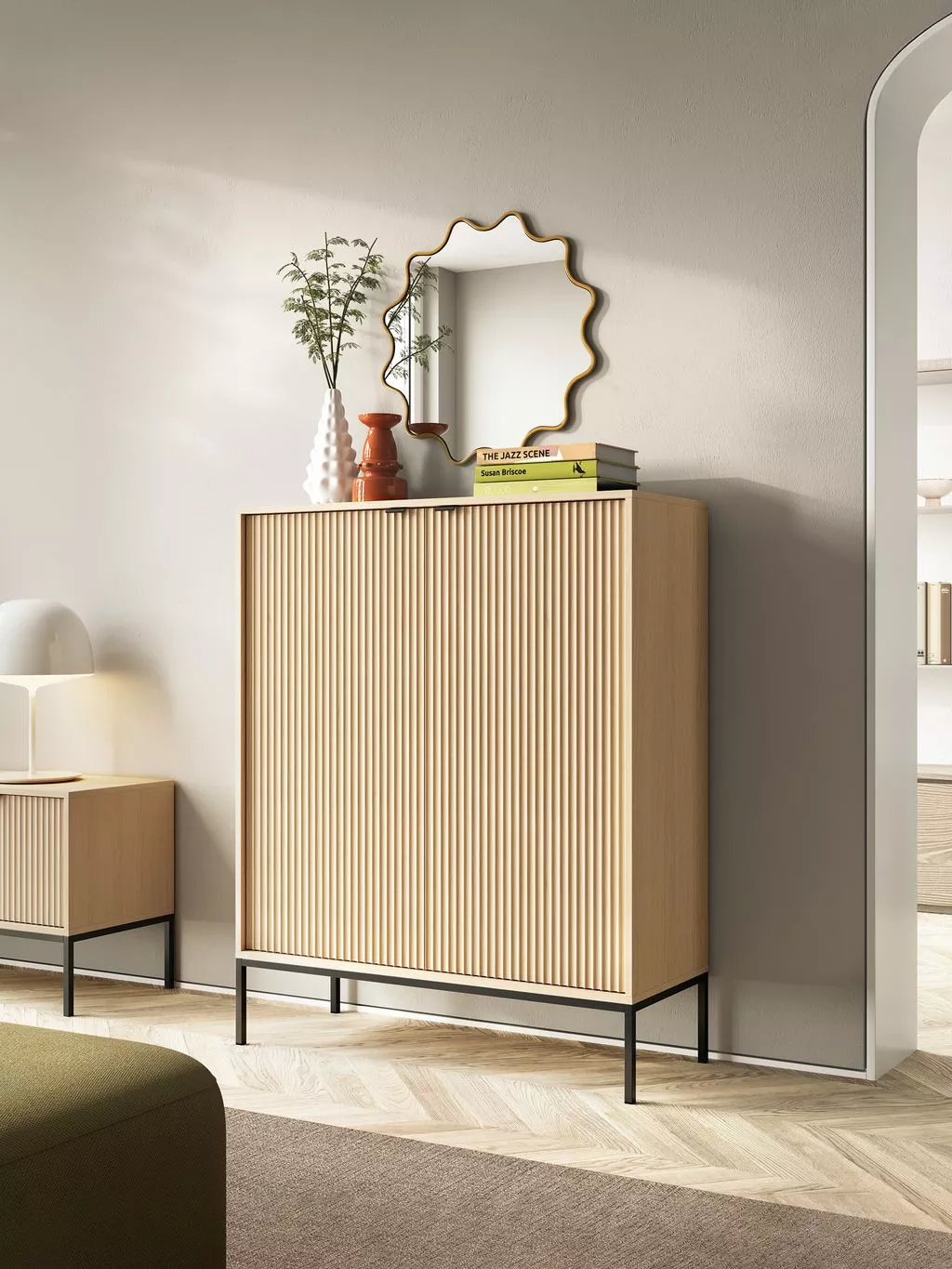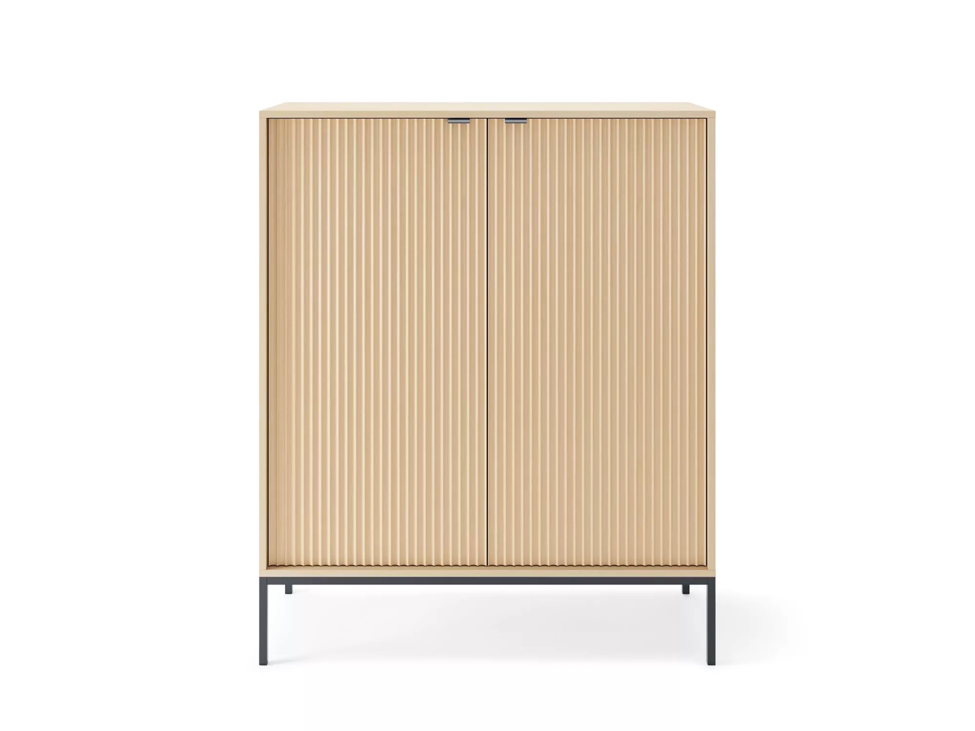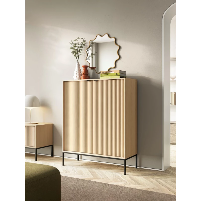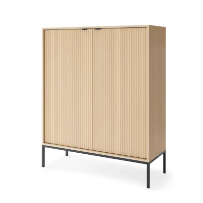 Vysoká komoda MISHEEL uchvátí především svým originálním a nadčasovým designem v podobě drážkovaných předních částí dvířek. Skvěle zapadne do obývacích pokojů nebo ložnic. Disponuje 2 skříňkami s policemi pro snadné uschování předmětů.