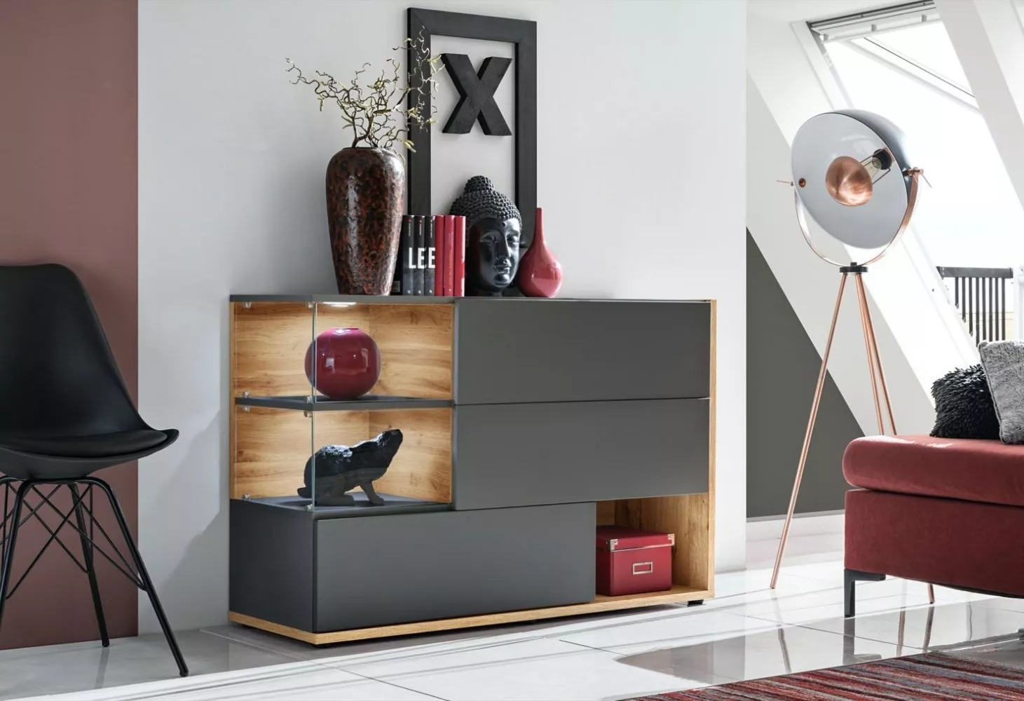 BOHI je vysoce kvalitní komoda do obýváku v moderním designu. Má výrazný vzhled, který kopíruje moderní trendy. Má dvě proslené části, které dokonale zobrazují dekorace nebo fotografie, tři části s výklopnámi dvířky a jednu otevřenou polici.