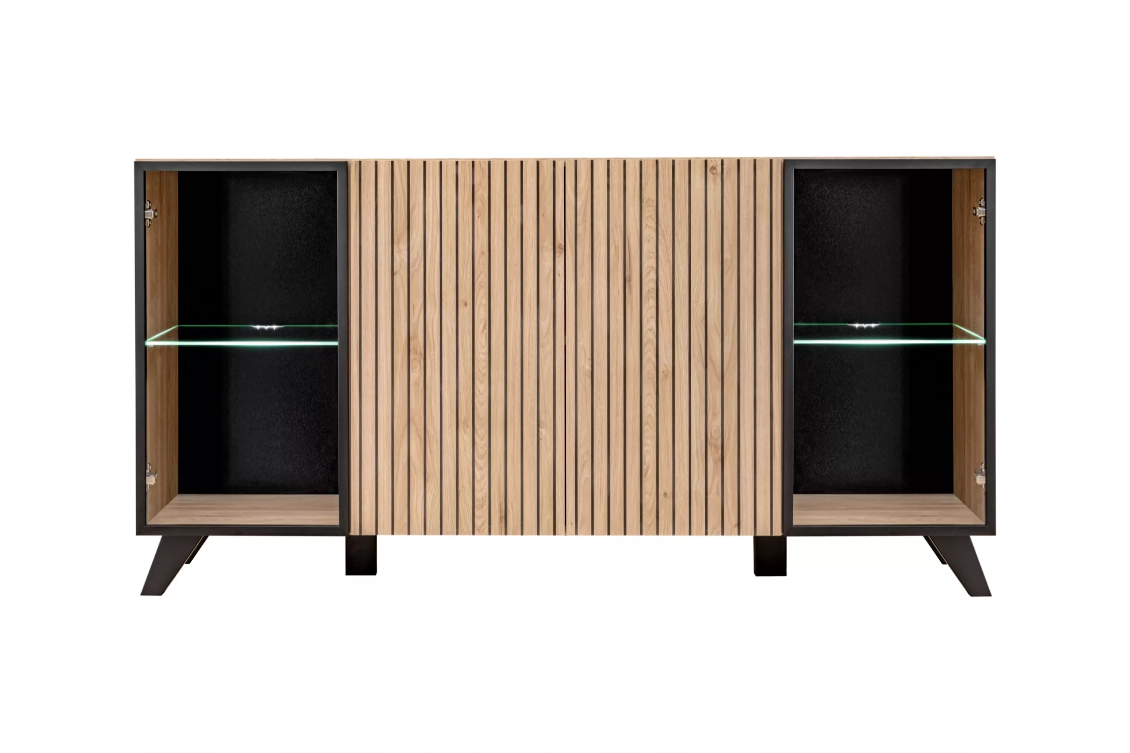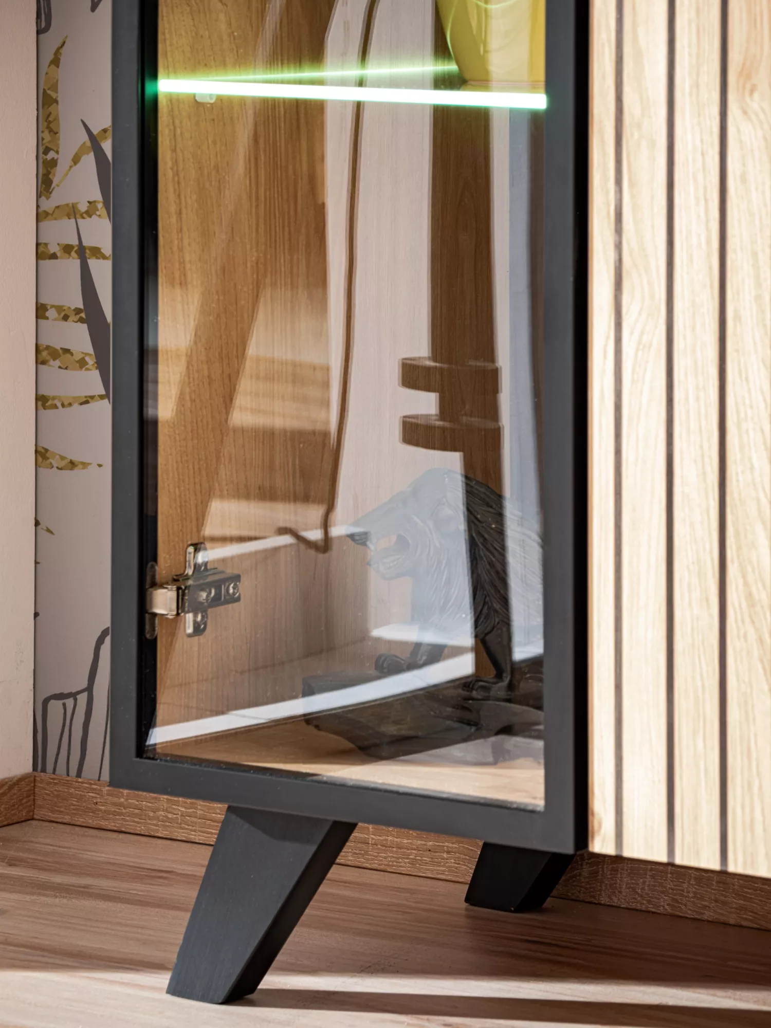 Prostorná komoda DEJANA je ideální pro vystavení vašich oblíbených položek, které budou navíc osvětleny LED osvětlením. Část vitríny má klasická dvířka, za nimiž schovává police, pro uložení dalších drobností.
