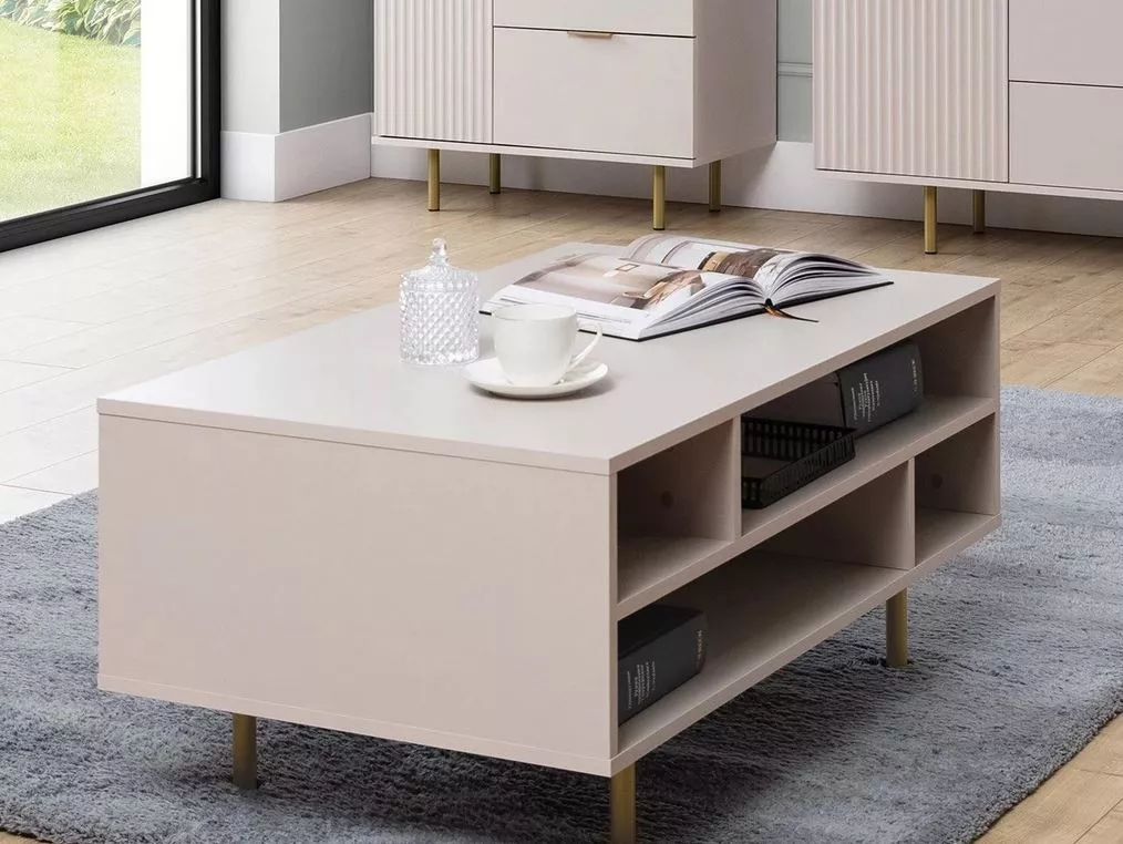 Konferenční stolek IREDELL kombinuje funkčnost s neuvěřitelným stylem. Kašmírová barva v kombinaci se zlatými prvky se skvěle hodí do současných i klasických interiérů. Díky prostorným policím snadno uložíte veškeré televizní příslušenství i časopisy.