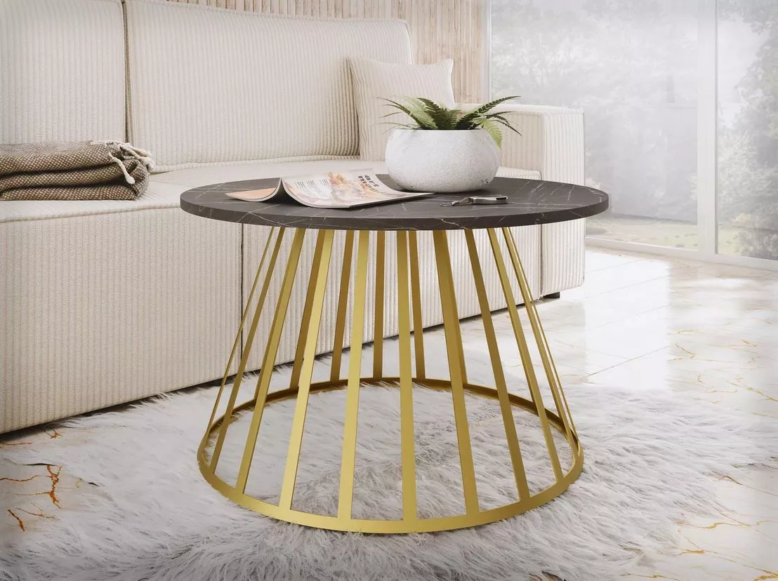 Konferenční stolek GRAFFI je dokonalou kombinací elegance a moderního stylu. Kulatá horní deska působí sofistikovaně, zatímco ocelový podstavec ve zlatém provedení s mřížkovým vzorem přidává stolku jedinečný designový prvek. Perfektně se hodí jako stylový doplněk v moderních interiérech, kde vynikne nejen svou funkčností, ale i estetickou hodnotou.