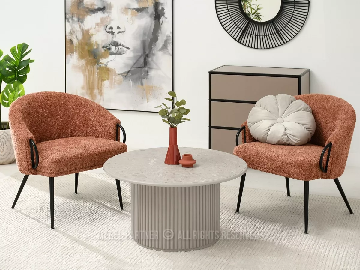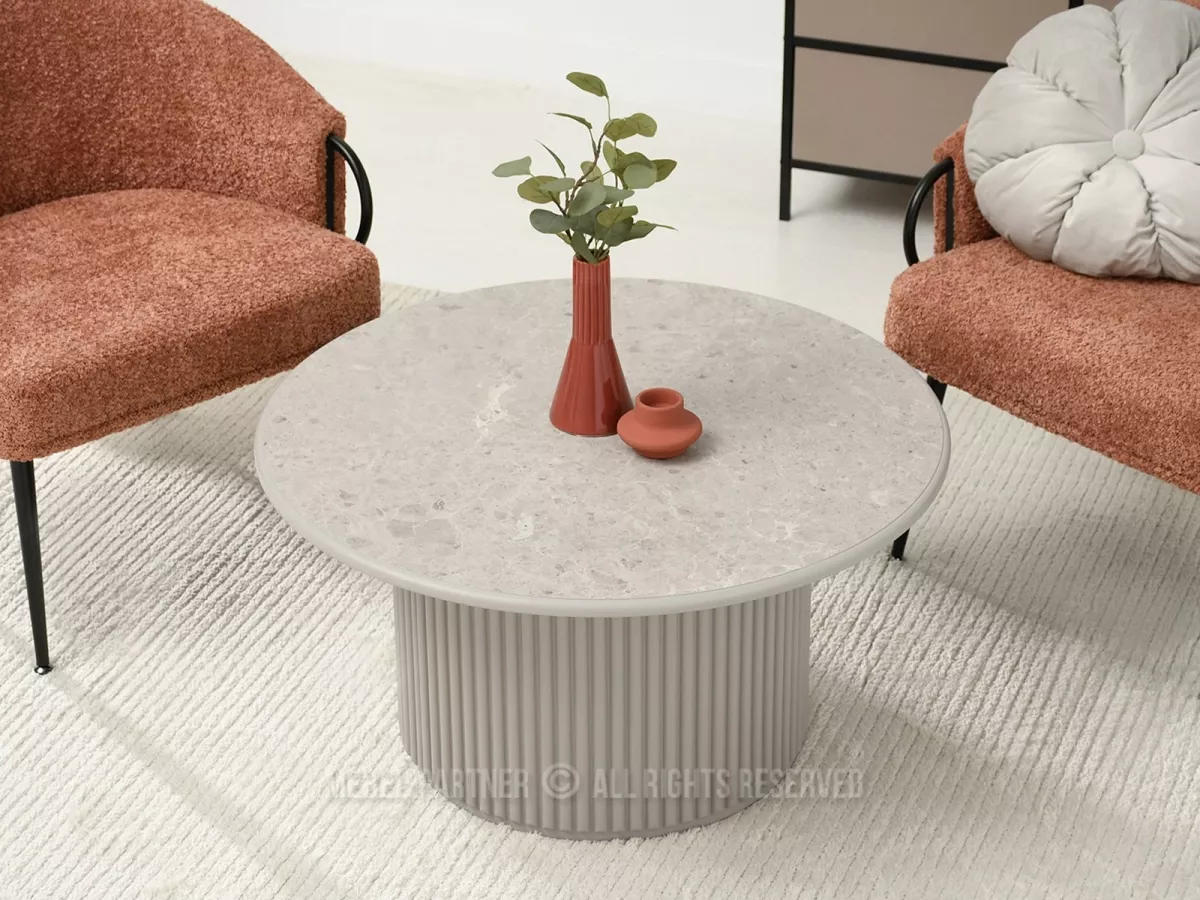 Kulatý konferenční stolek ALBAN se strukturou šedého mramoru spojuje eleganci kamene s praktičností moderních materiálů. Podstava zaujme především svým drážkováním.