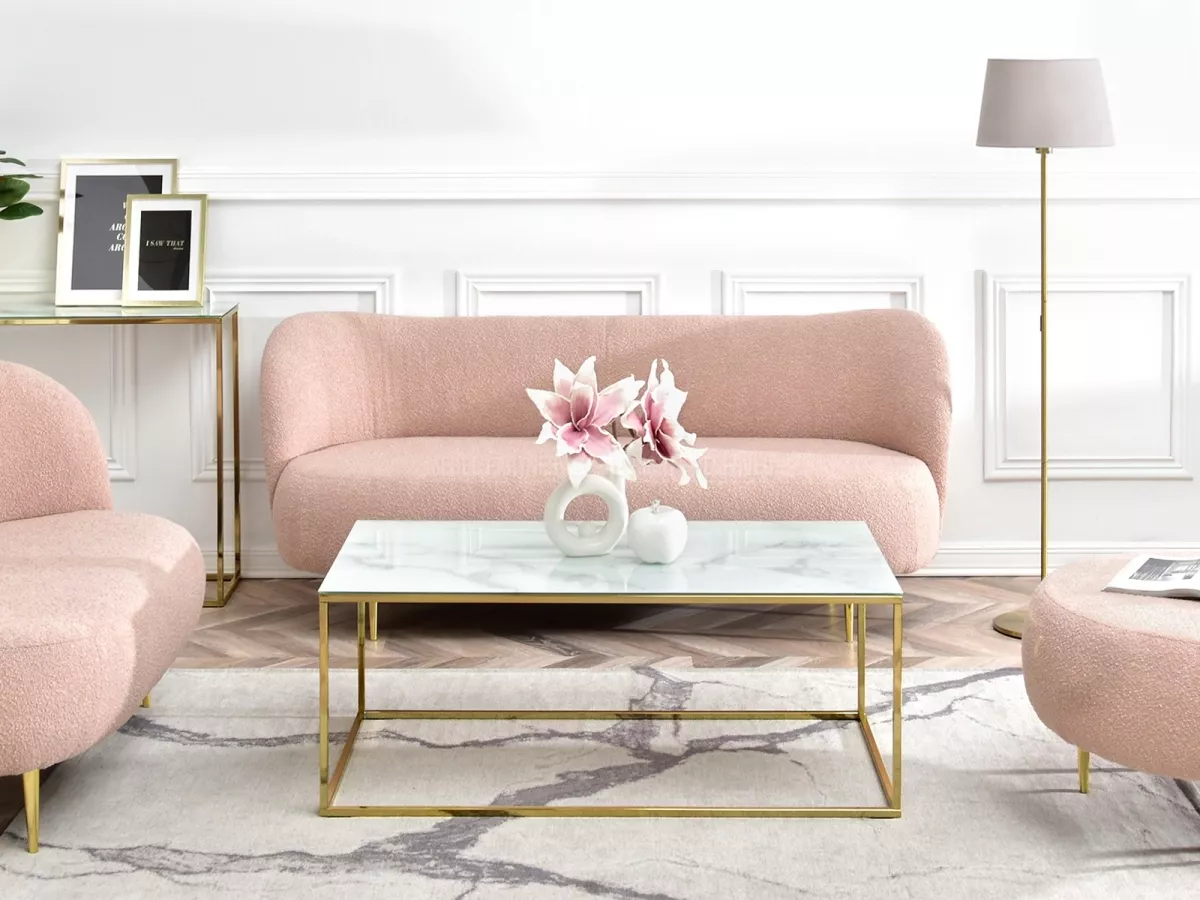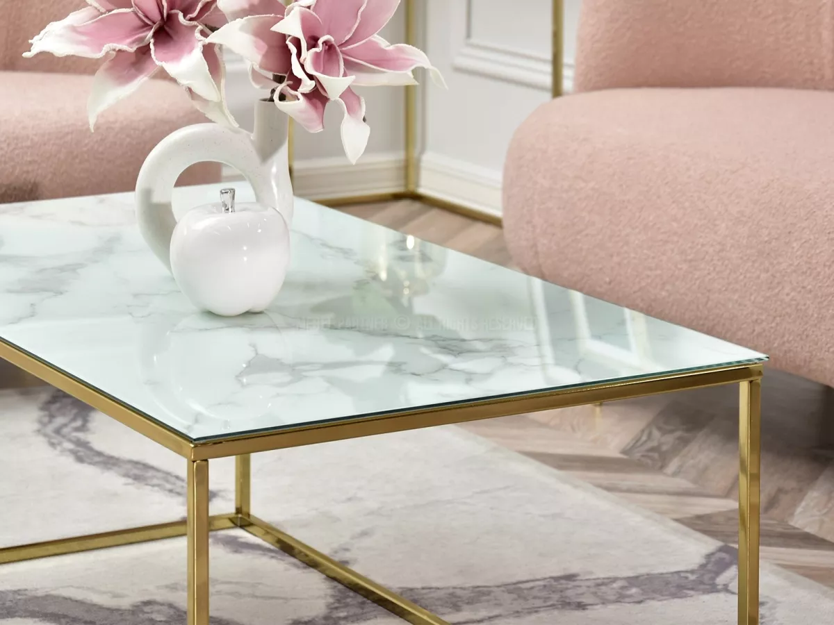 Obdélníkový konferenční stolek JENAR je kus nábytku, který se bude dobře vyjímat v luxusních interiérech. Perfektním doplňkem horní desky je konstrukce zlaté barvy, vyrobená z odolného kovu, který zajistí dlouhodobé používání nábytku.
