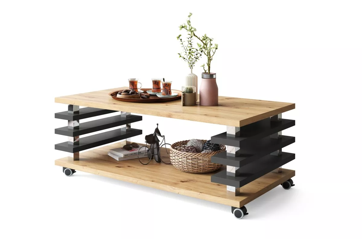 Konferenční stolek s lamelami BOGARD je moderním nábytkem do obývacích pokojů. Díky pojízdným kolečkům je přesouvání stolku velmi snadné. Součástí stolku jsou i nožky, které lze namontovat podle vašich preferencí.