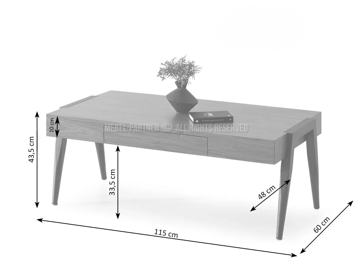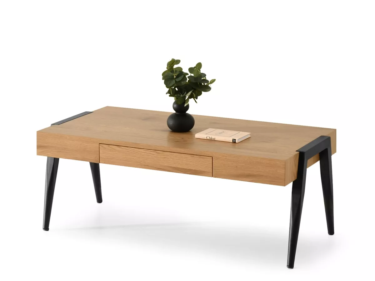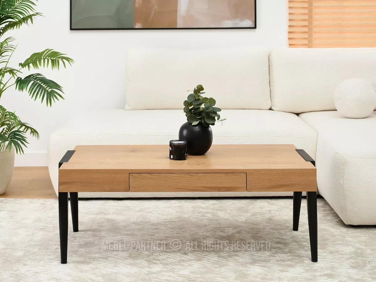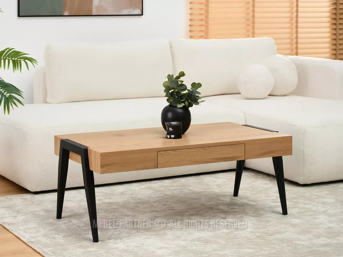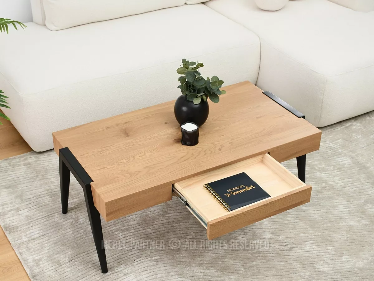 Konferenční stolek SEBASTIAN se díky úložnému prostoru v podobě šuplíku stane praktickým kusem nábytku ve vašem obývacím pokoji. Stabilitu stolku dodávají designové kovové nohy.