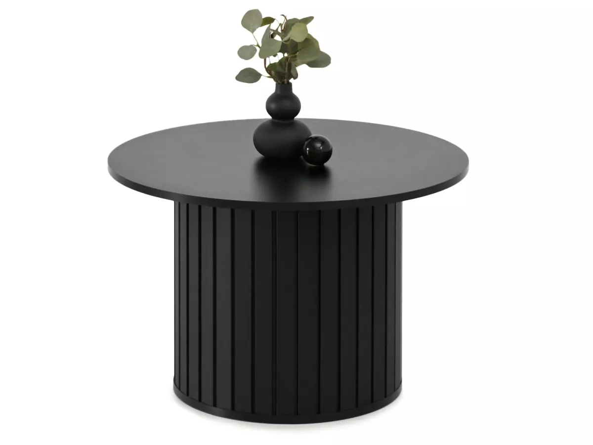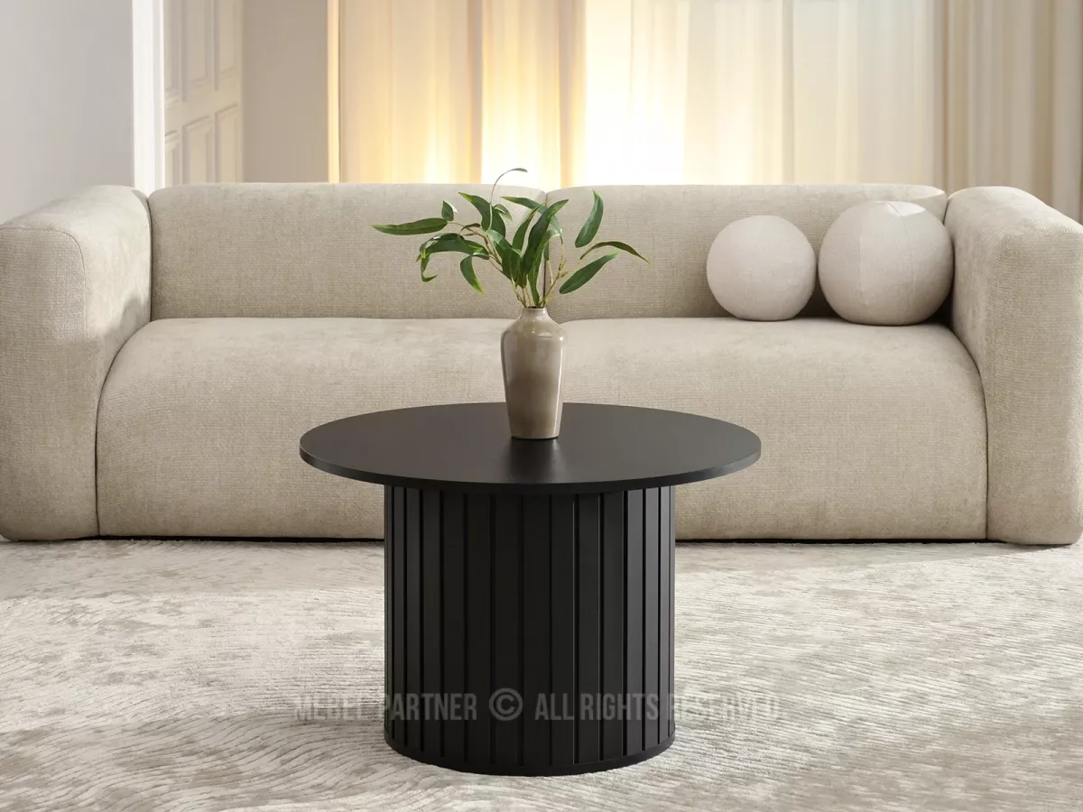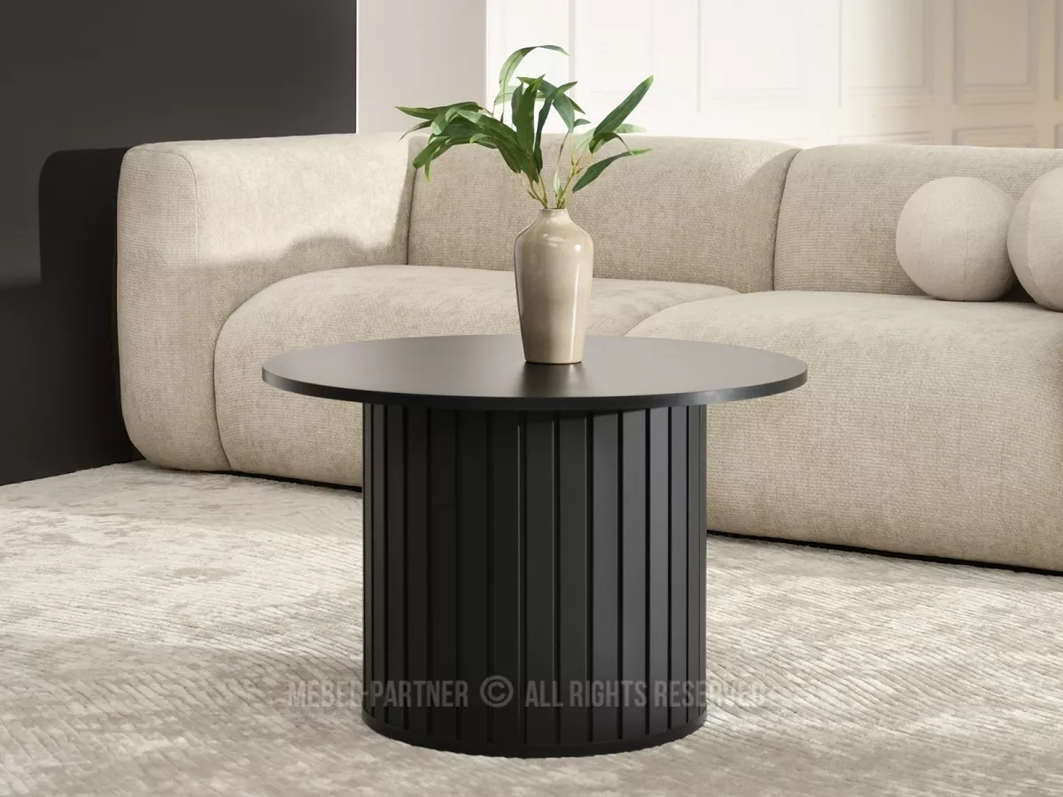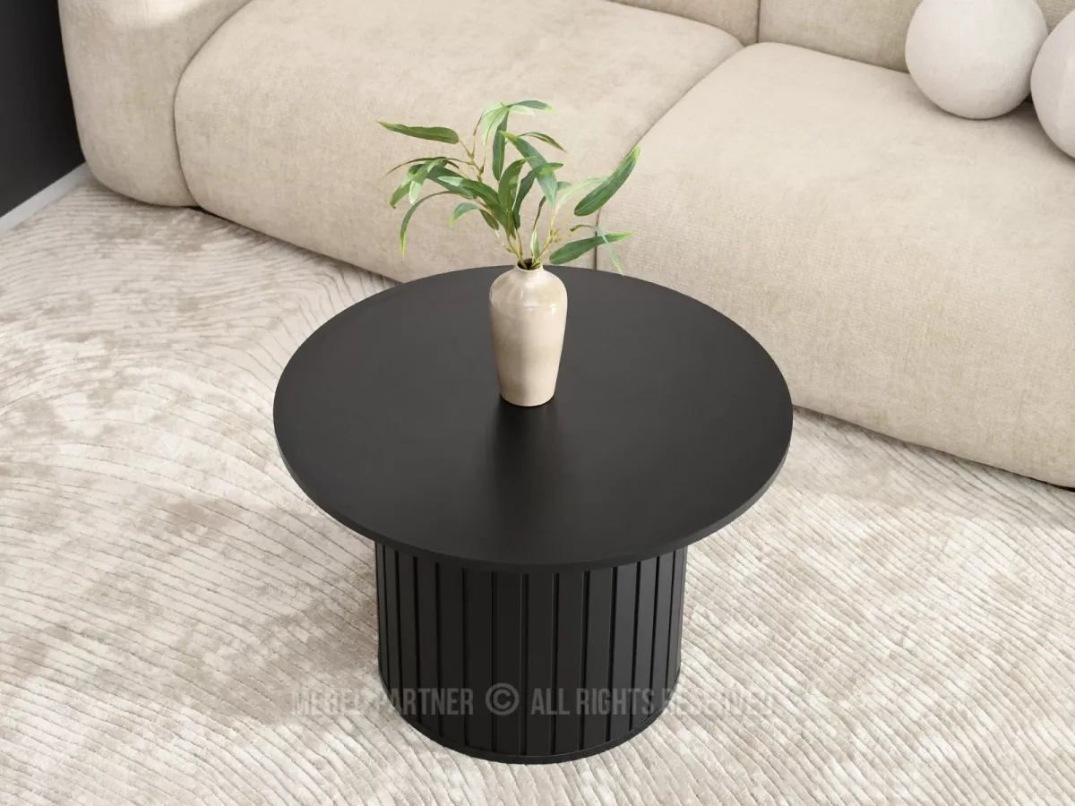 Kulatý konferenční stolek KATO má charakteristickou základnu zdobenou lamelami, která vnáší do interiéru nádech modernosti. Stolek je vyroben z materiálů odolných vůči poškození a poškrábání, takže vám bude sloužit mnoho let.