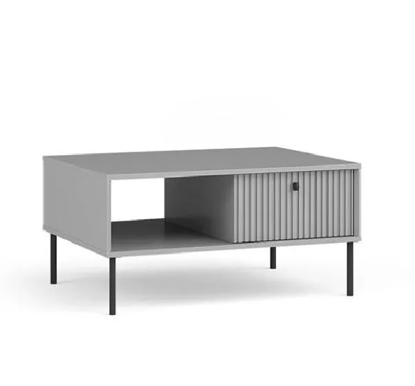 Konferenční stolek MALAMBO se vyznačuje módní šedou barvou, která do interiéru vnáší klid a harmonii. Drážkovaná čela s jemnou texturou a pevné černé kovové nohy dodávají stolku lehkost a industriální šmrnc. Černé oválné úchytky pak tvoří elegantní kontrast a podtrhují celkový vytříbený vzhled.