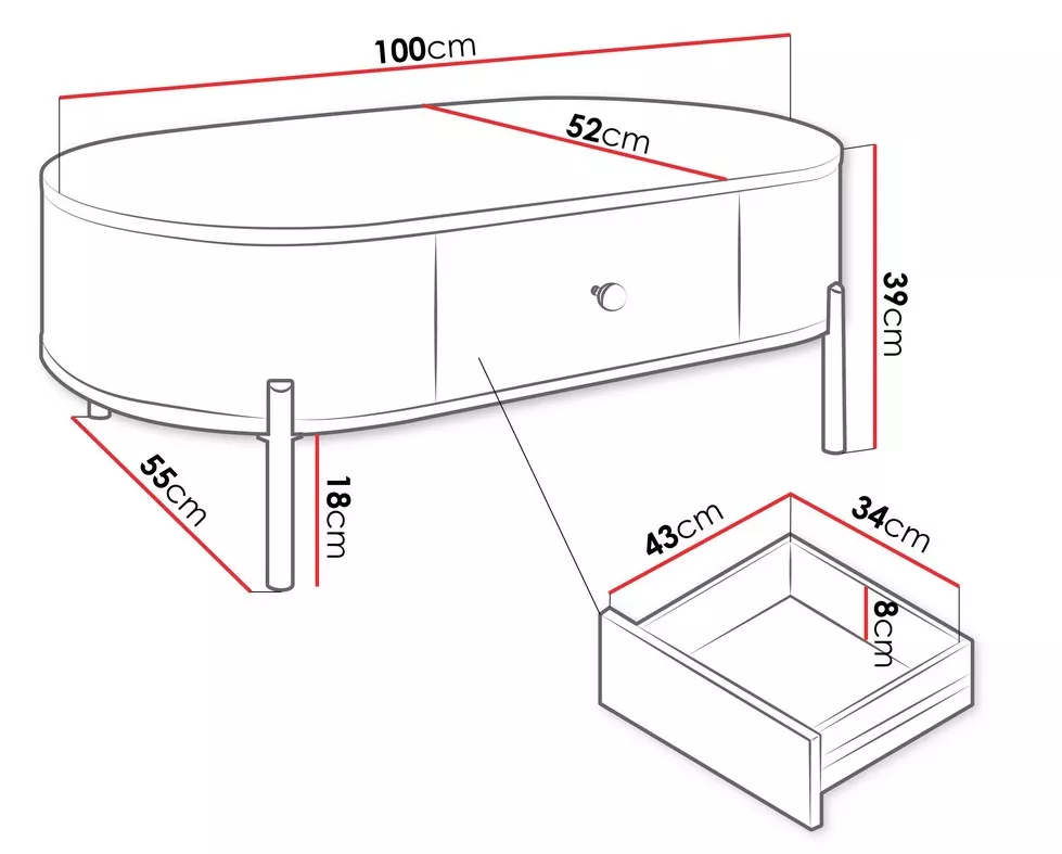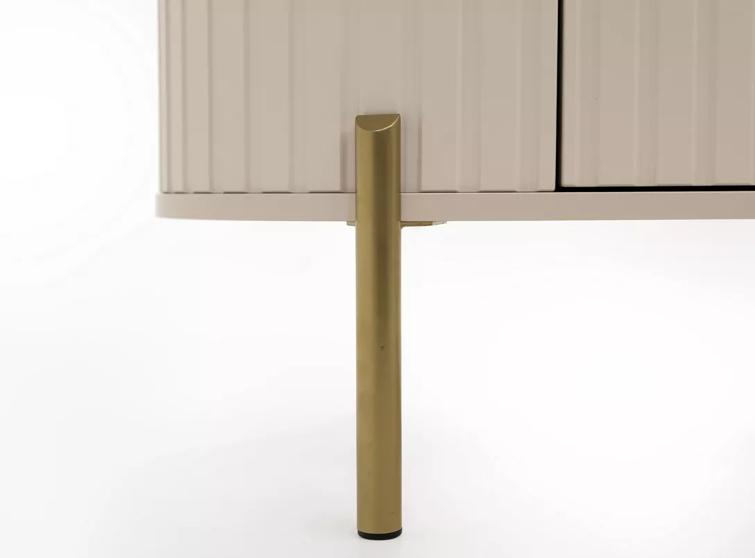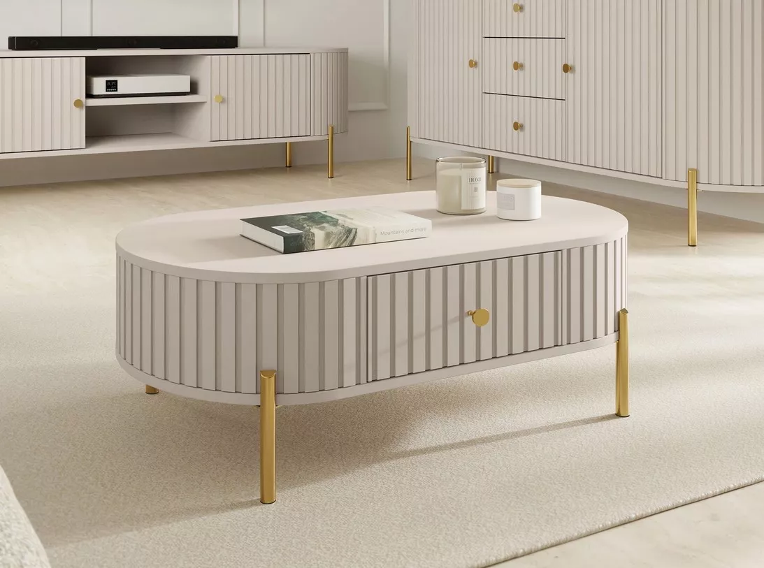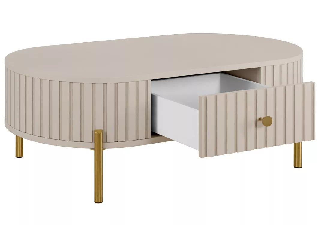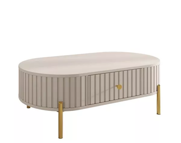 Konferenční stolek TAZEVEL okouzlí moderním designem a elegantním, zaobleným tvarem. Zlaté nohy dodávají stolku lehkost a jedinečný charakter, zatímco frézované přední díly vytvářejí působivý vizuální efekt. Praktická zásuvka poskytuje prostor pro uložení nezbytností, které chcete mít vždy po ruce.