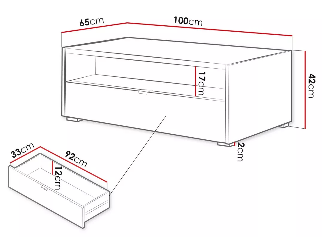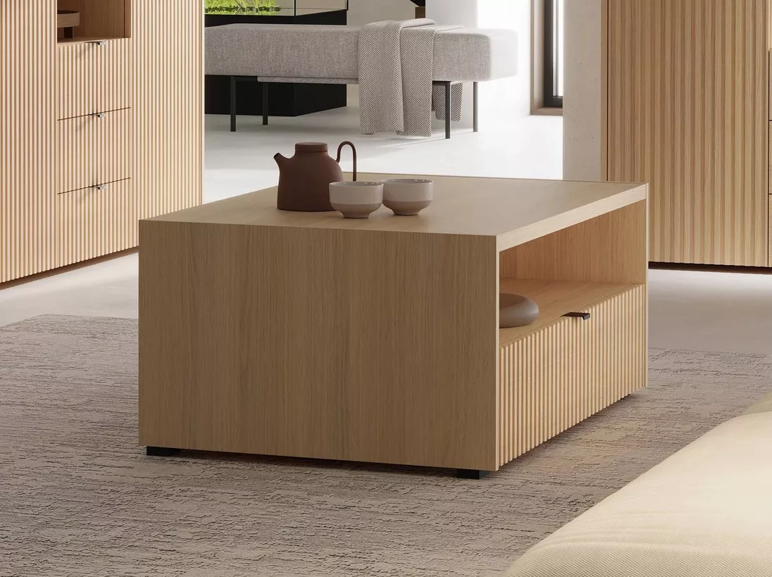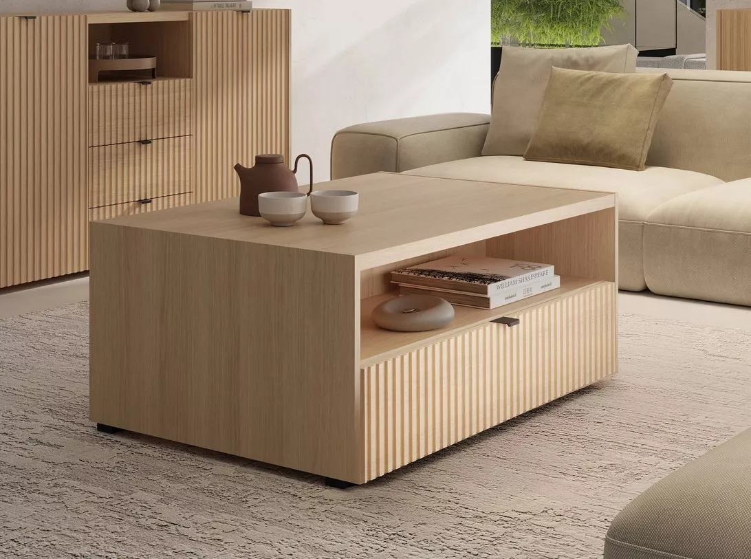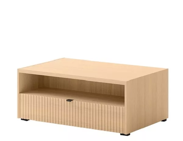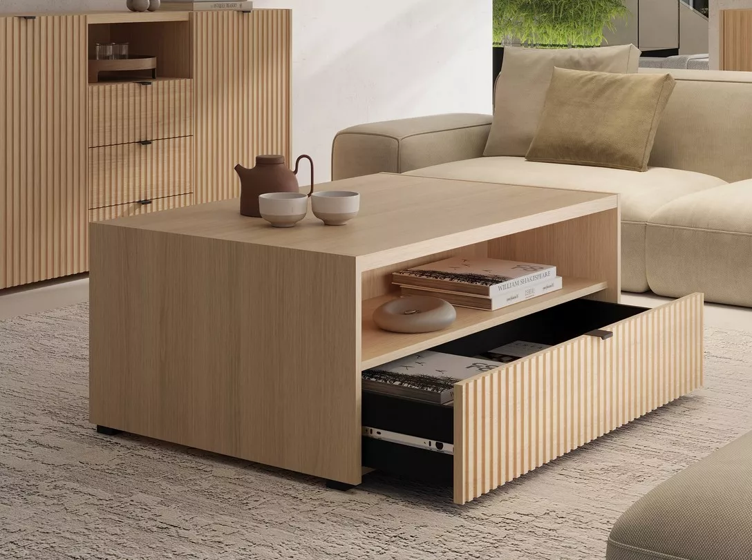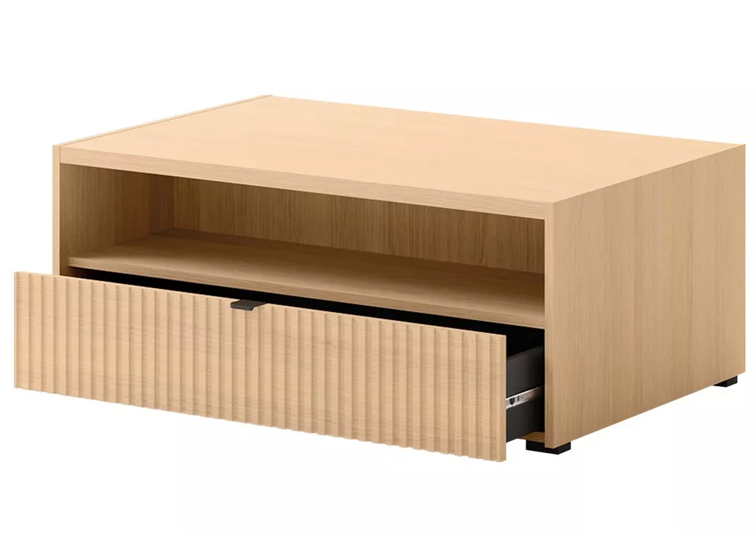 Konferenční stolek TROUTDALE zaujme moderním designem s přírodním dekorem a praktickým řešením úložného prostoru, kde prostorná zásuvka pojme elektroniku i další drobnosti, zatímco velká polička nabízí místo pro brýle či dálkový ovladač, takže vše potřebné je vždy po ruce.