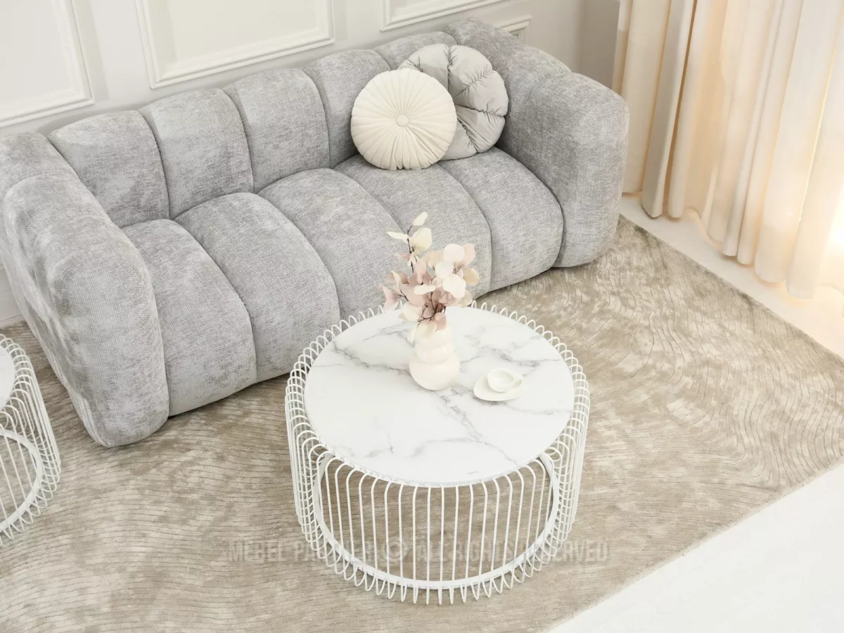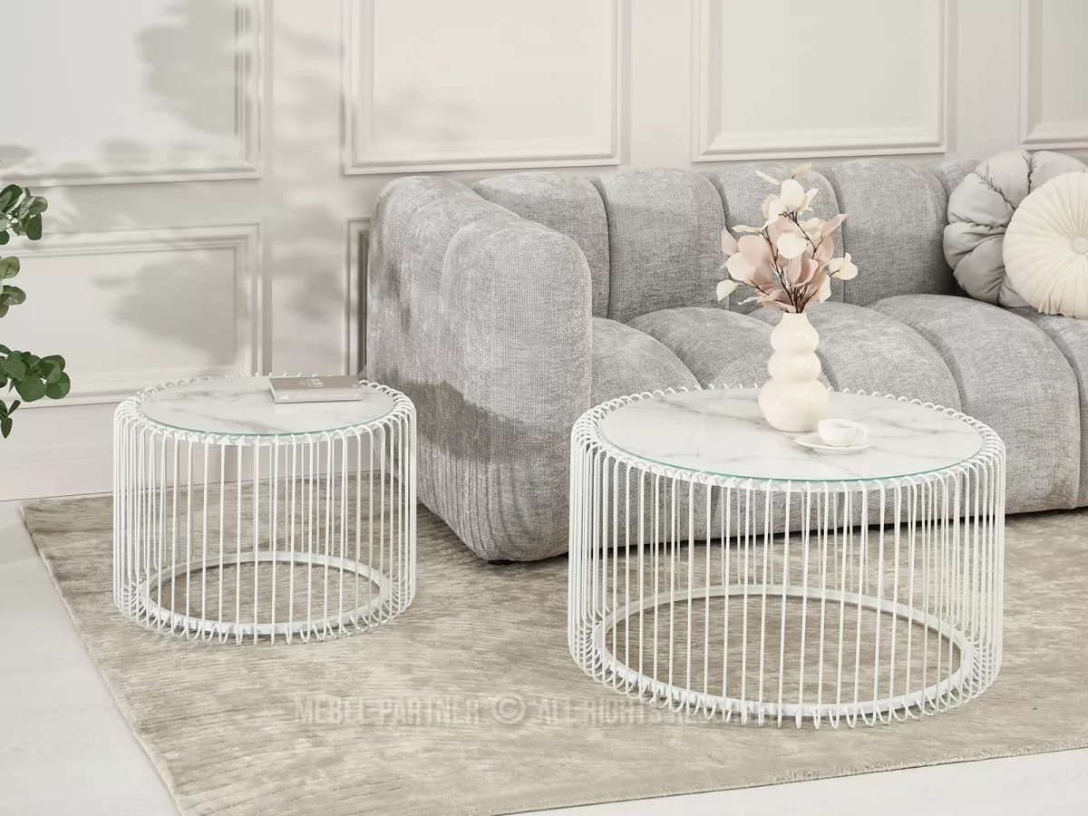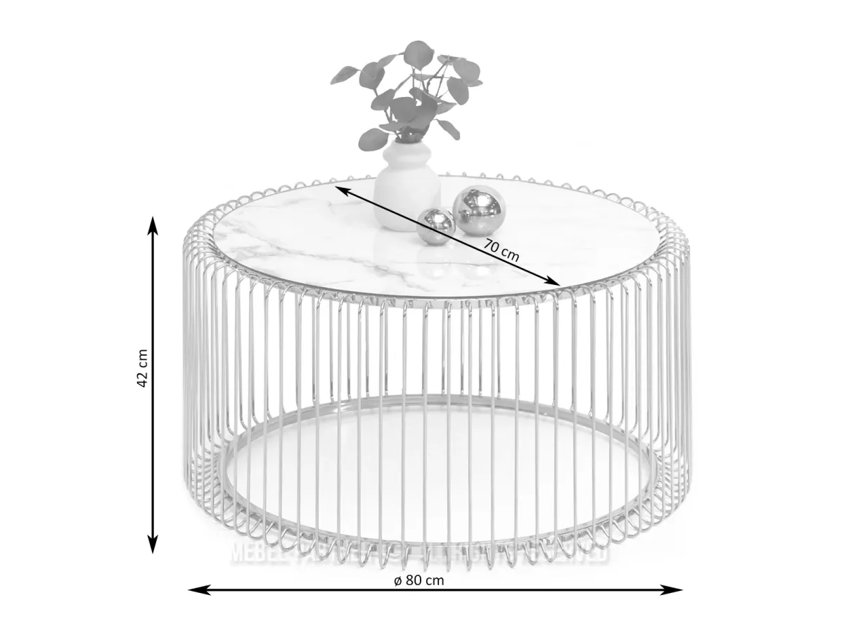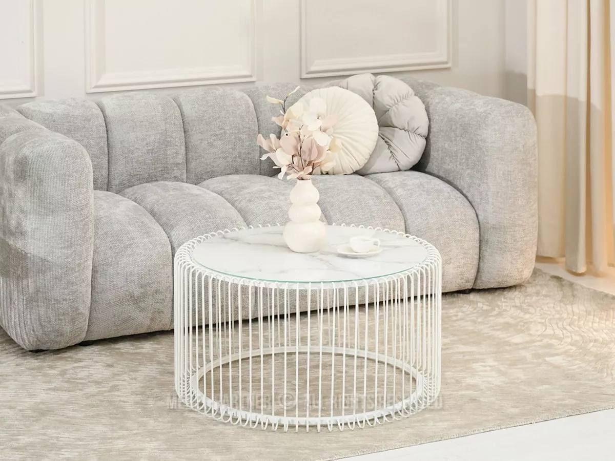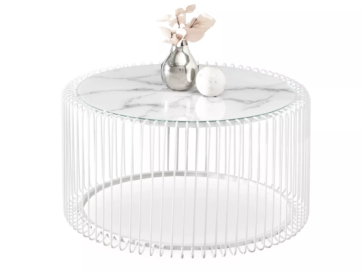 Kulatý konferenční stolek IRAKLI zaujme svou stylovou podnoží v bílé barvě. Horní deska je vyrobená z tvrzeného skla imitujícího mramor.