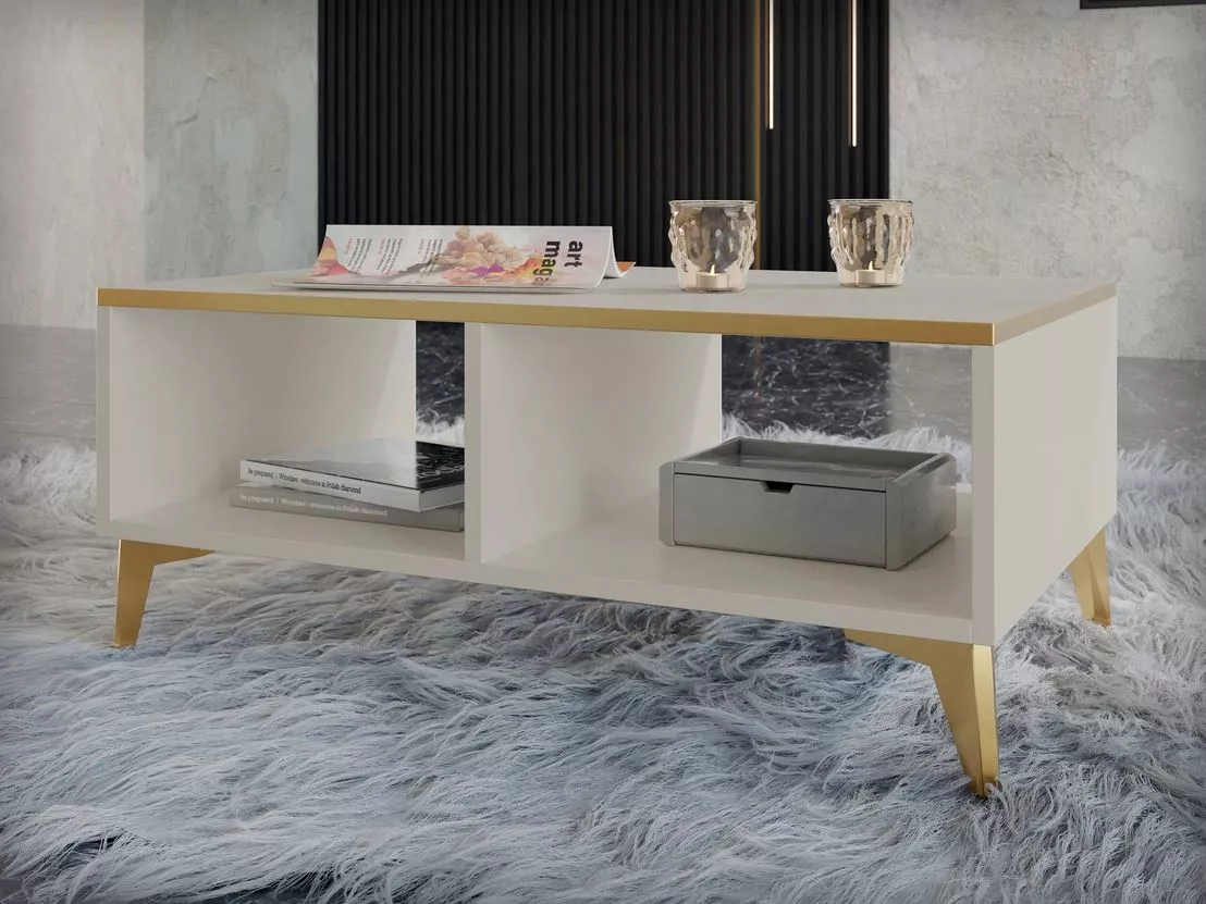 Konferenční stolek do obýváku LIVA zaujme svou všestranností a krásným designem. Vysoké pozlacené nožky a neutrální barva stolku jistě naleznou své uplatnění nejen v moderních interiérech. Poličky nabízejí dostatek místa pro uložení časopisů, her a dalších předmětů, které chcete mít po ruce.