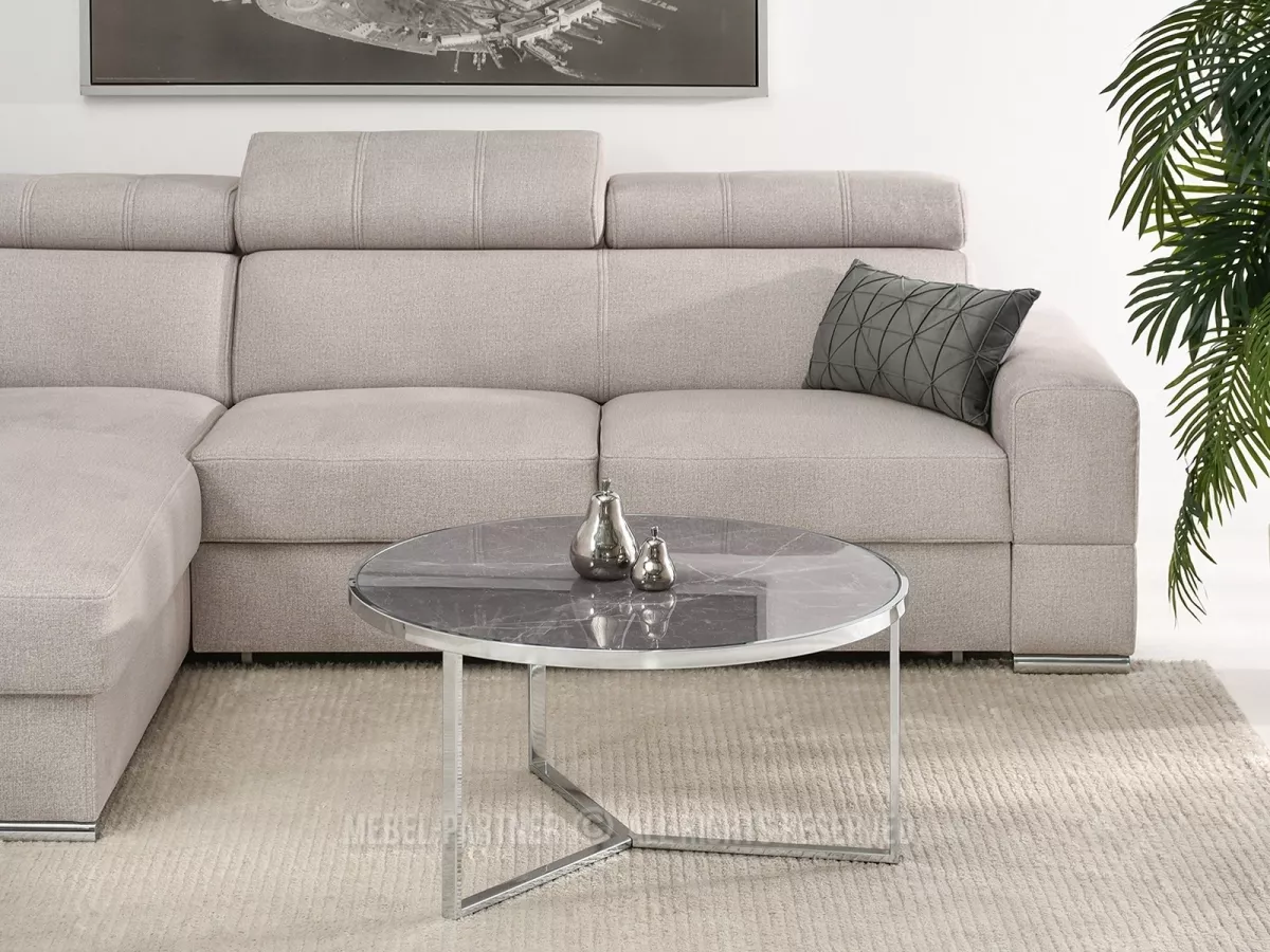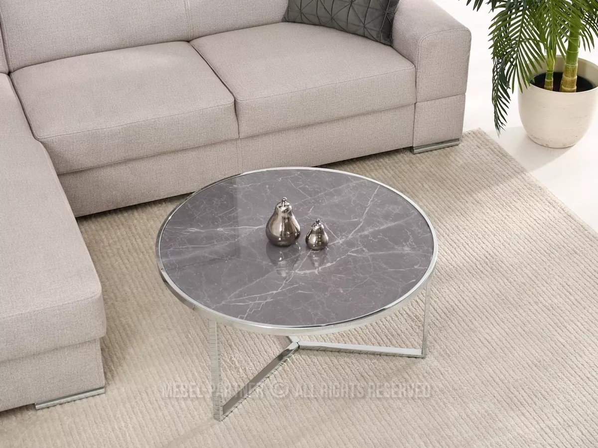 Kulatý konferenční stolek GEOMAR se svou kombinací šedého mramoru a chromu skvěle hodí do každého luxusního interiéru. Pevná kovová konstrukce zajišťuje stolku stabilitu.