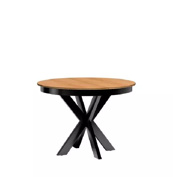 Kulatý stůl DELA s unikátními kovovými nohami a kulatou deskou z karamelového dubu. V případě potřeby lze stůl jednoduše a rychle rozložit do šířky 150 cm. Ideální pro společné večeře a večírky.