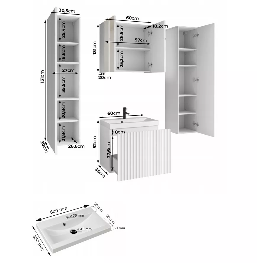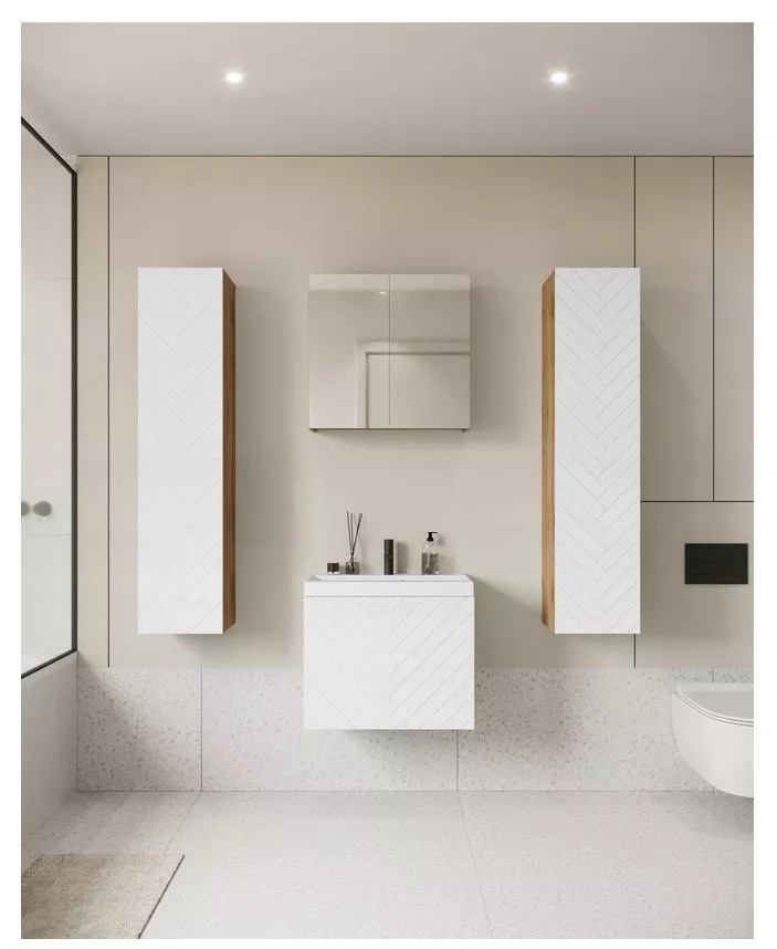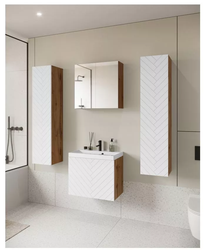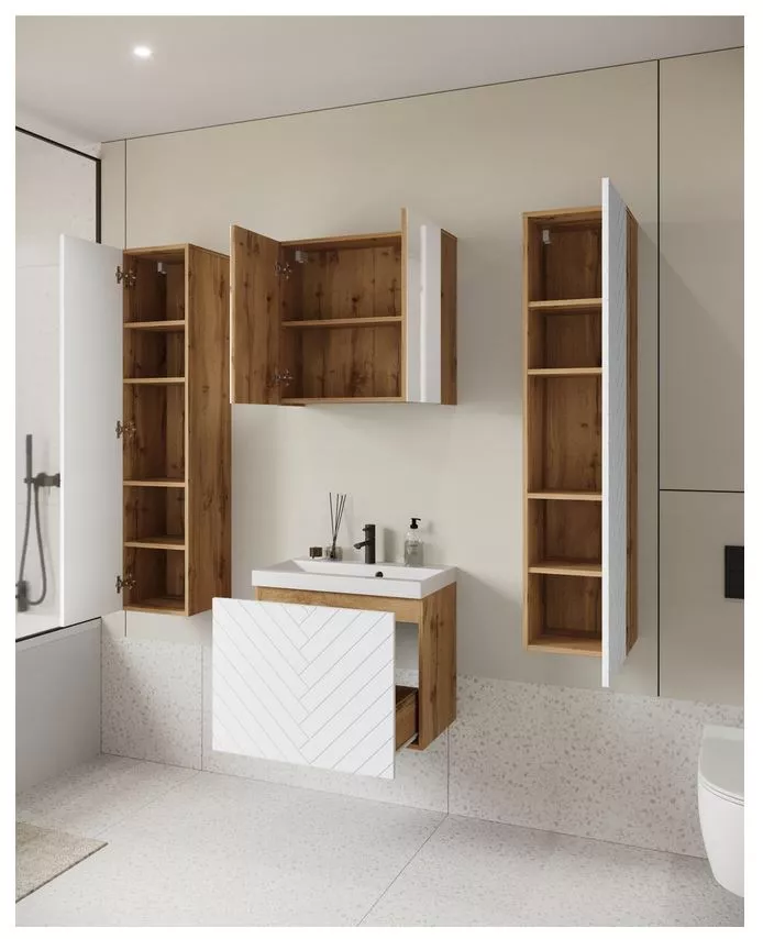 Koupelnový set se zrcadlem IZORIA XL 1 zaujme svým moderním zpracováním a vysokou funkčností. Set obsahuje 2 vysoké skříňky, skříňku pod umyvadlo a zrcadlovou skříňku. Výhodou závěsné sestavy je snazší úklid a ušetření prostoru, proto je vhodná i do menších koupelen.