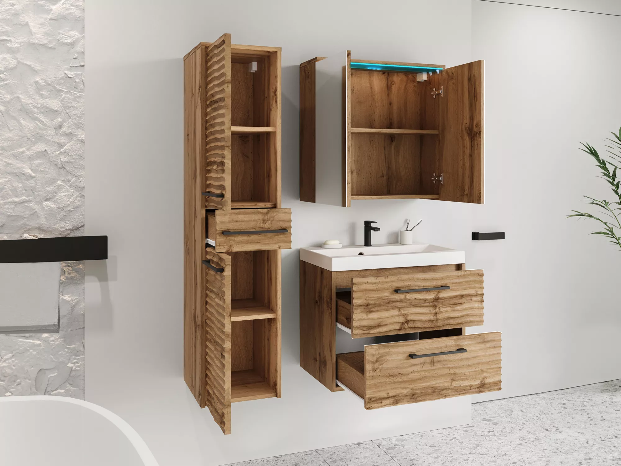 Praktická a stylová koupelnová sestava s velkorysým úložným prostorem vám umožní udržet vaši koupelnu čistou a organizovanou. Zrcadlo nejen krásně doplní vzhled koupelny a opticky zvětší prostor, ale také poskytne dostatek místa pro všechny vaše kosmetické doplňky. Součástí sestavy je také moderní umyvadlo, které dokonale ladí s designem, sifon a praktické modré LED osvětlení.