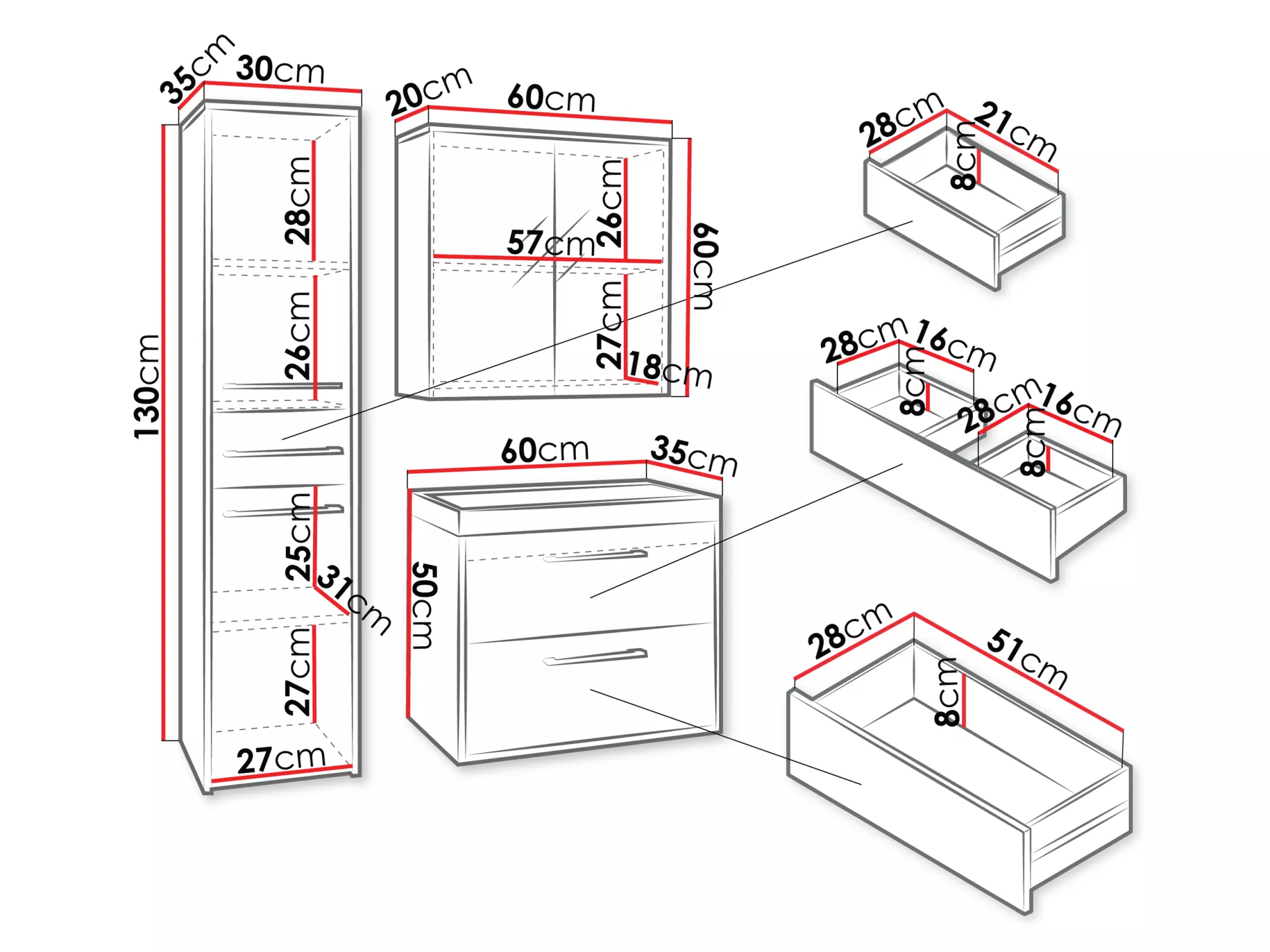- vysoká skříňka: 30/130/35 cm