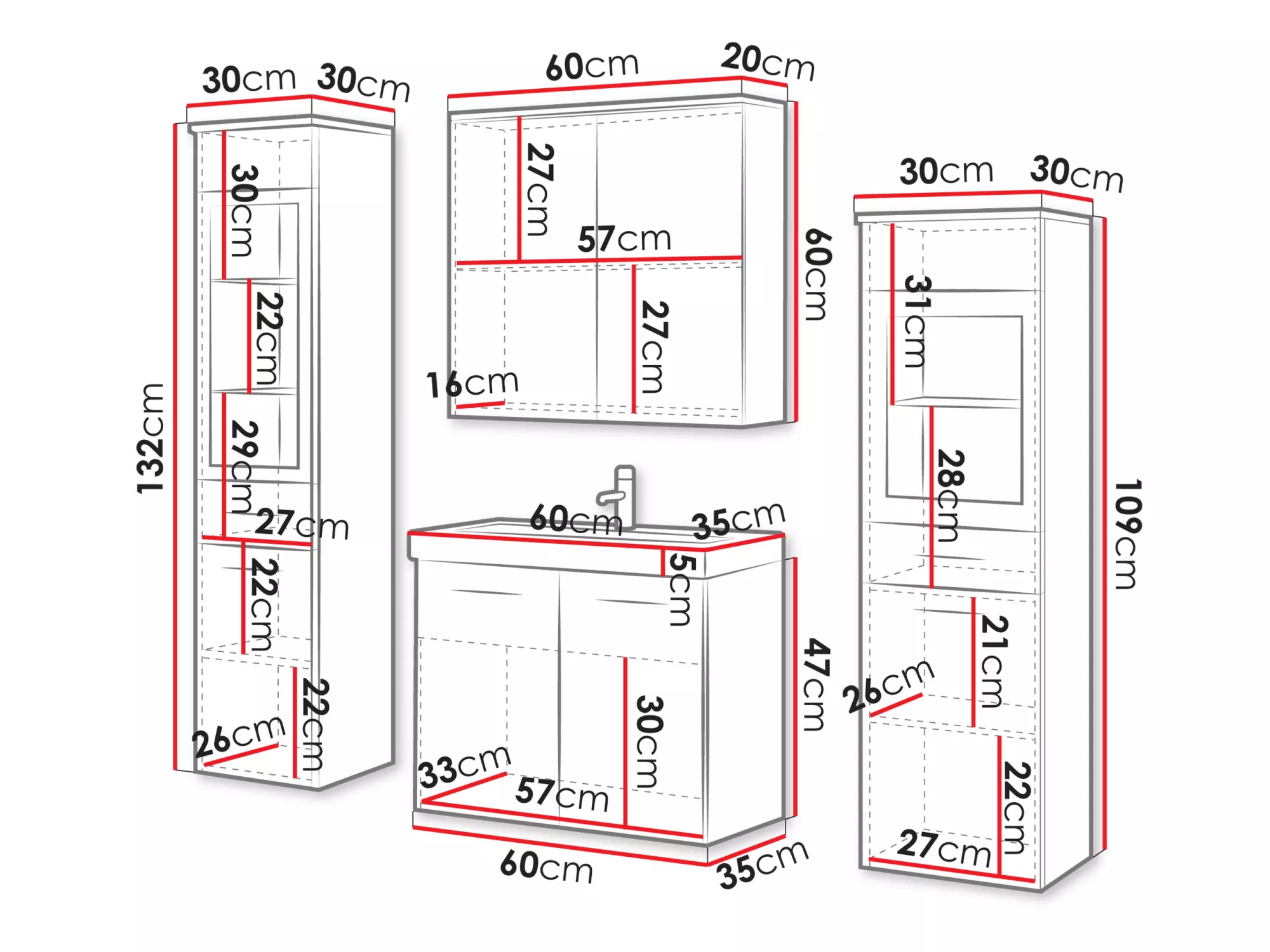 - skříňka pod umyvadlo: 60/47/33 cm