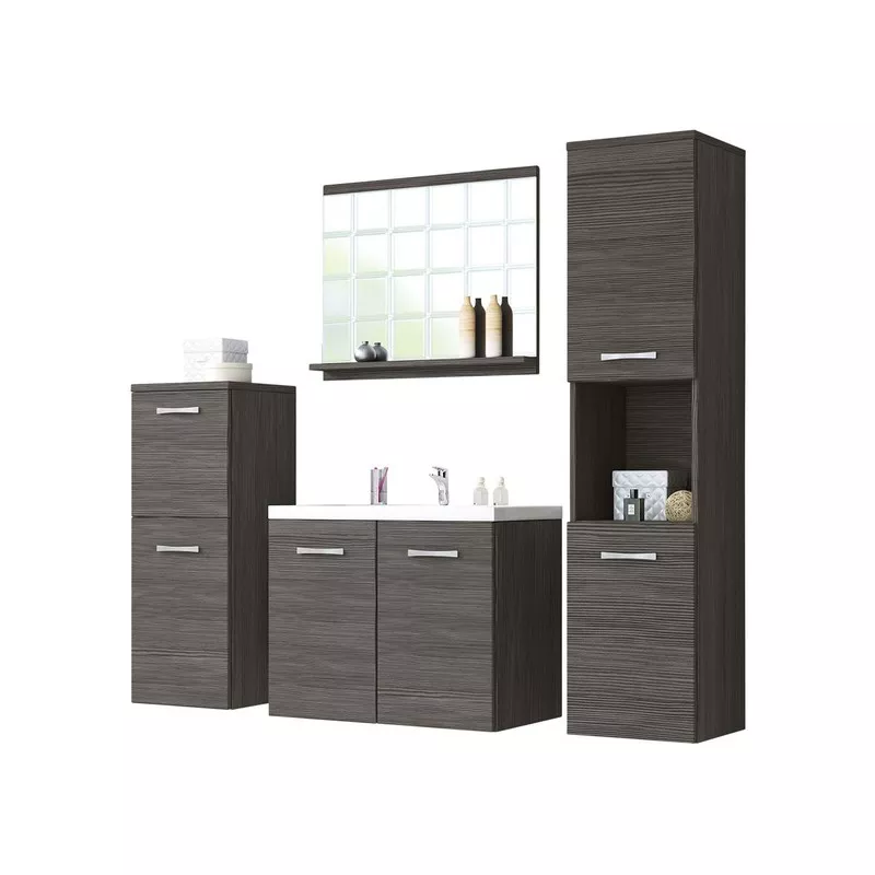 Koupelnová sestava Whitney dokonale ladí s moderními designy koupelen. Sestava se skládá ze čtyř prvků. Úložný prostor poskytují dvě vysoké policové skříňky, které poslouží na úschovu například ručníků a koupelnových doplňků. Otevřená police nabízí uskladnění nejnutnější věcí, oblíbených parfémů nebo laků na nehty. Umyvadlová skříňka poslouží například k úschově čistících prostředků. Posledním prvkem sady je zrcadlo s poličkou.