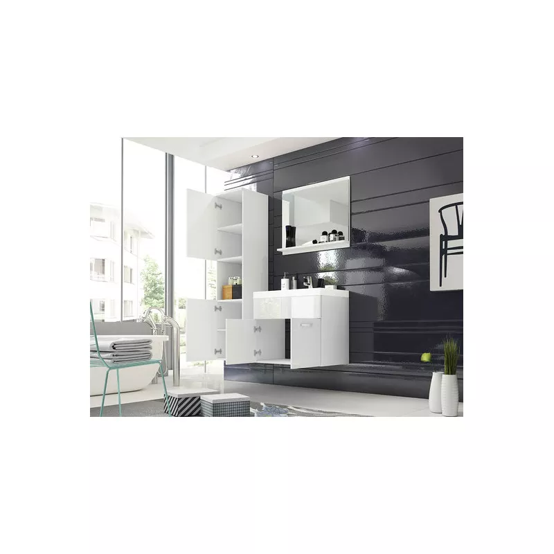 Koupelnová sestava ZORAIDA dokonale ladí s moderními designy koupelen. Sestava se skládá ze čtyř prvků. Úložný prostor poskytuje vysoká policová skříňka, která poslouží na úschovu například ručníků a koupelnových doplňků. Otevřená police nabízí uskladnění nejnutnější věcí, oblíbených parfémů nebo laků na nehty. Umyvadlová skříňka poslouží například k úschově čistících prostředků. Posledním prvkem sady je zrcadlo s poličkou.