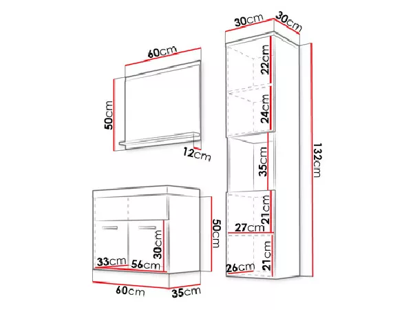 - vysoká skříňka: 30/132/30 cm