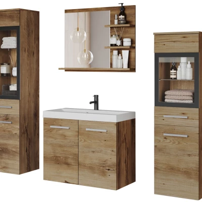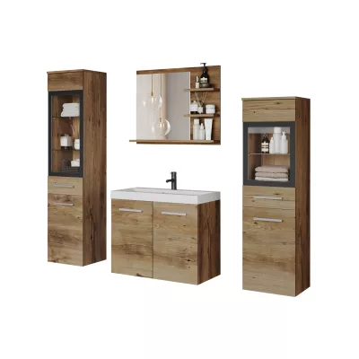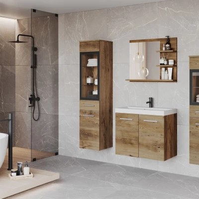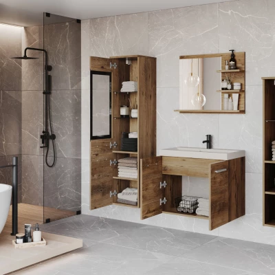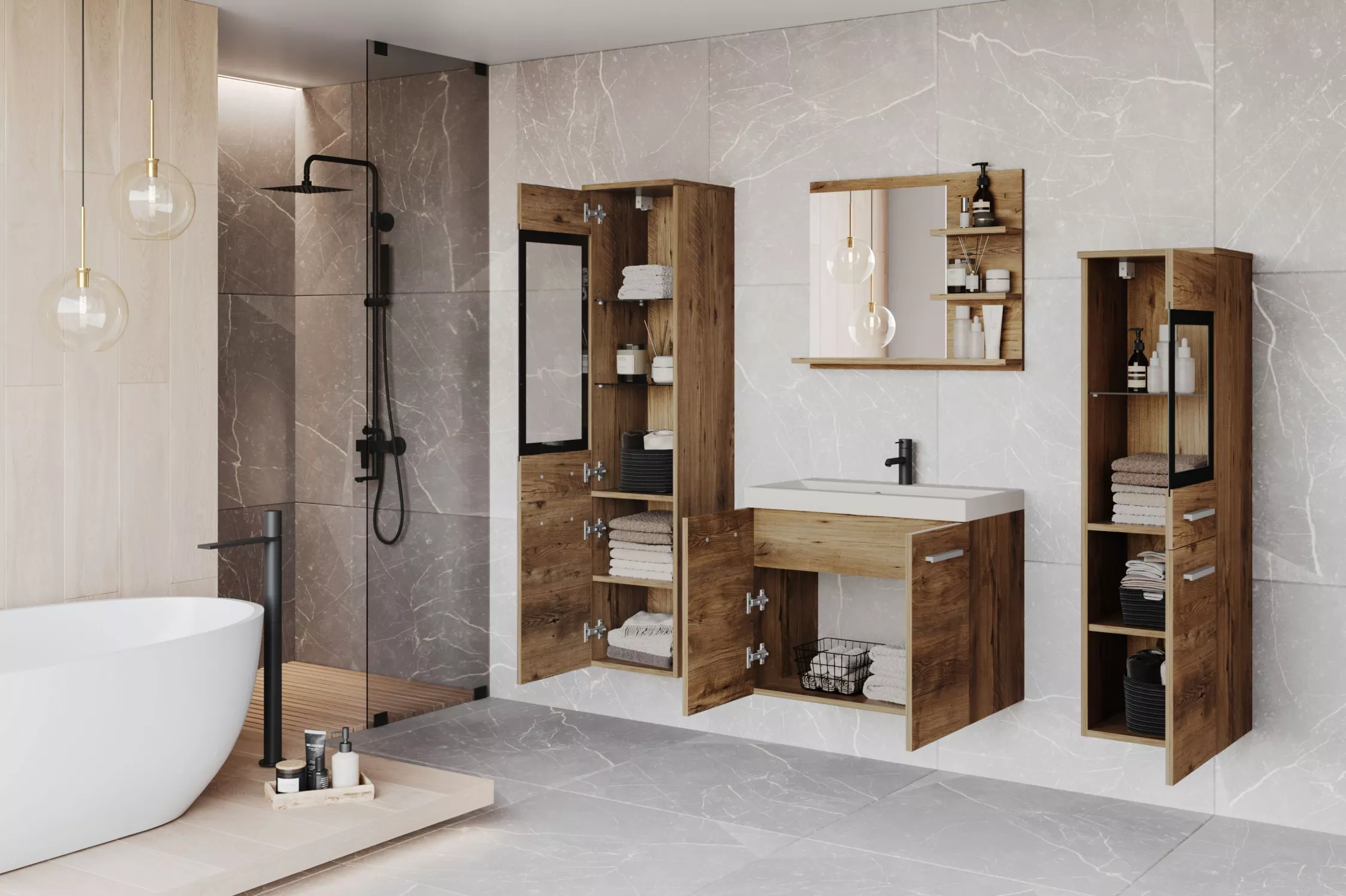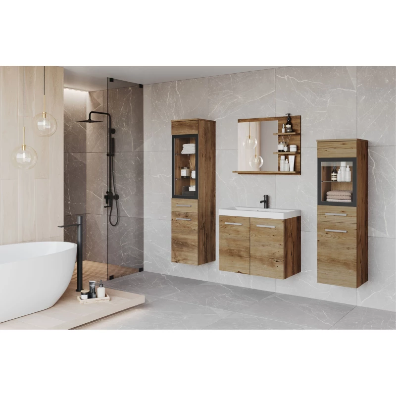 Koupelnovou sestavu ESTELA I tvoří 2 závěsné skříňky, umyvadlo z litého mramoru, skříňka pod umyvadlo a police se zrcadlem. Odolné LTD a ABS hrany chrání nábytek před mechanickým poškozením a vlhkostí.