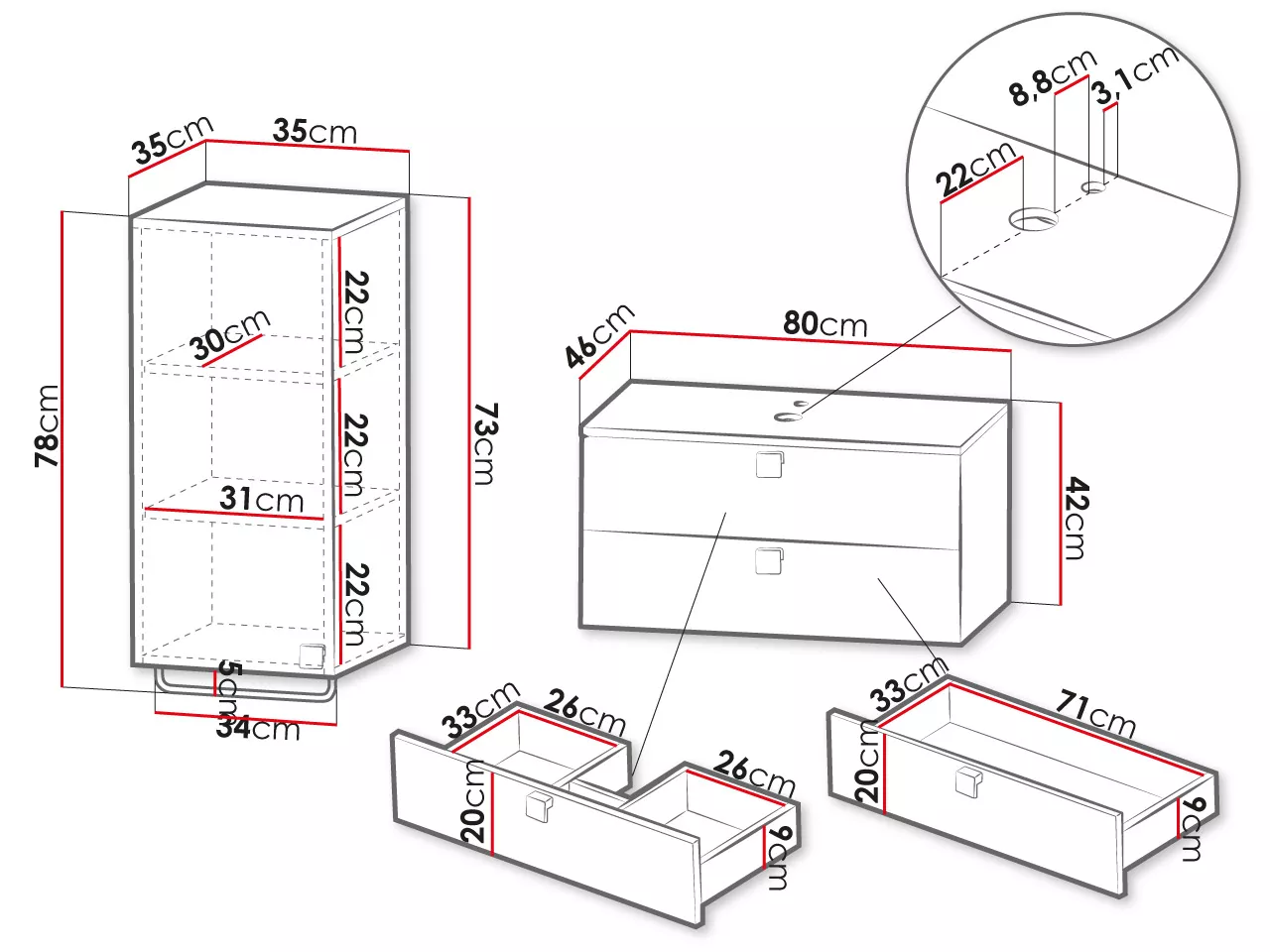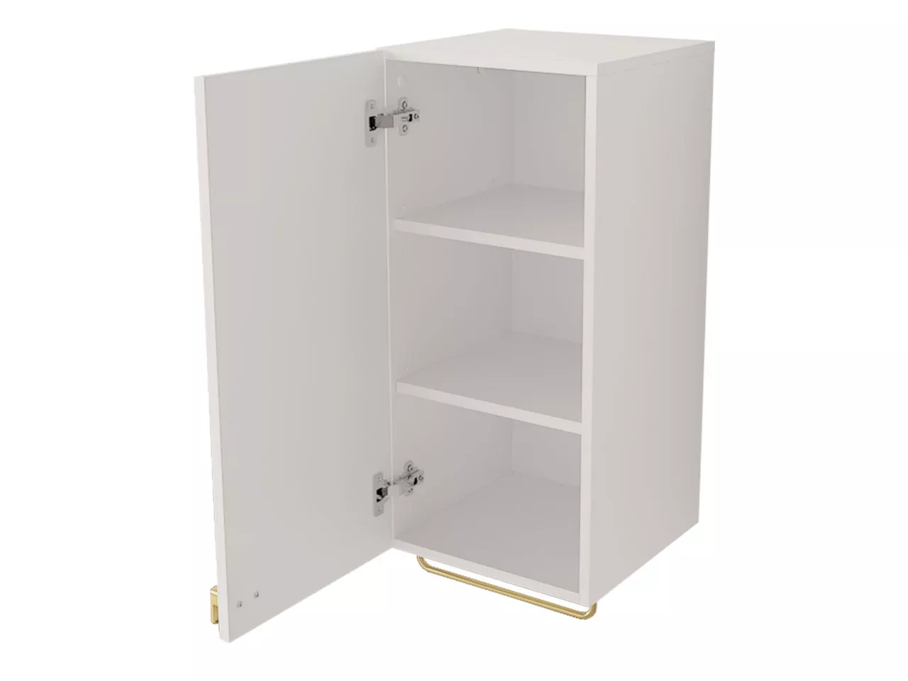 Závěsná koupelnová sestava PALOMA 3 se vyznačuje vysokou funkčností a odolností. Minimalistický vzhled nábytku doplňují frézované přední díly s elegantními zlatými detaily. Sestavu tvoří skříňka pod umyvadlo, uzavřená skříňka a umyvadlo.