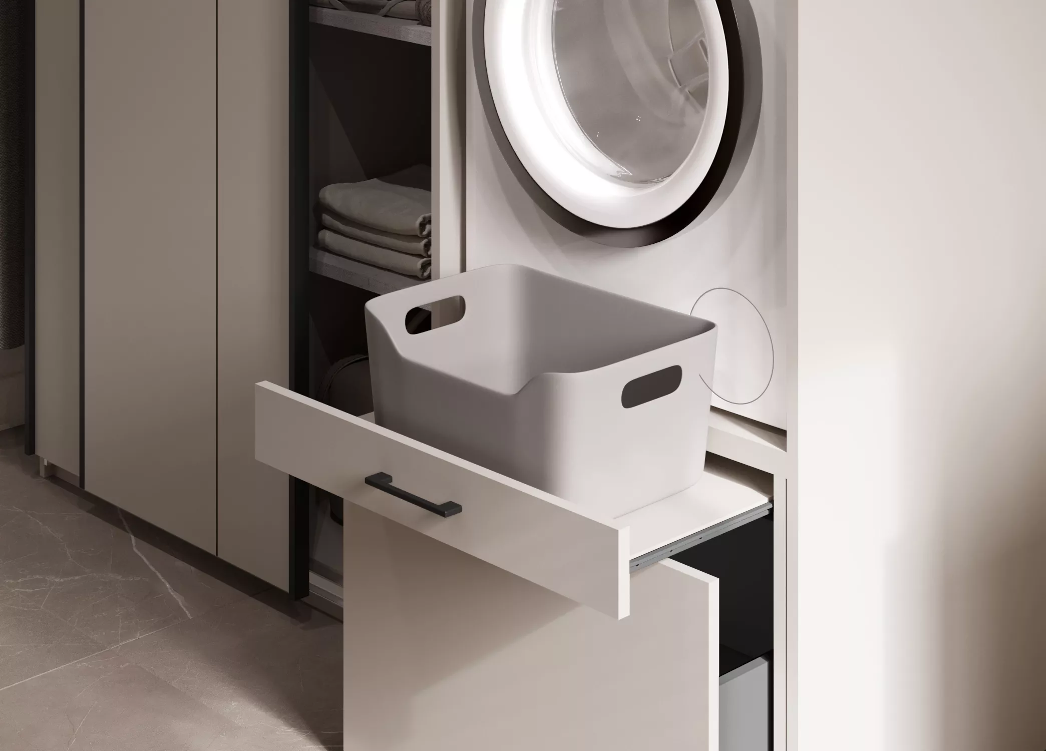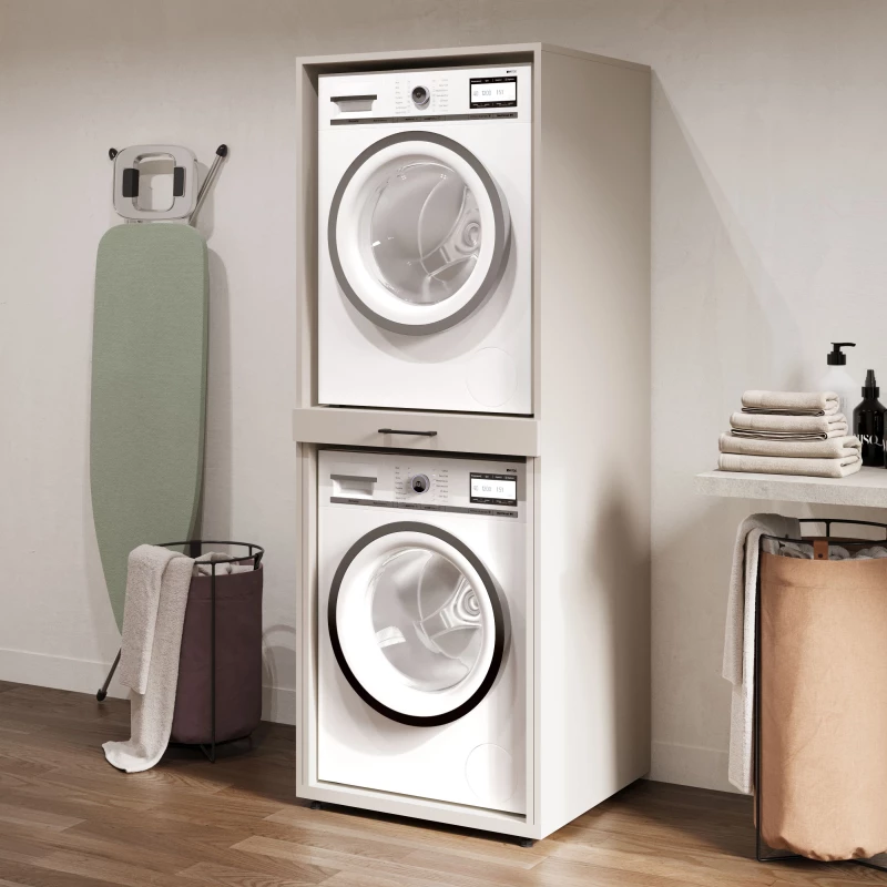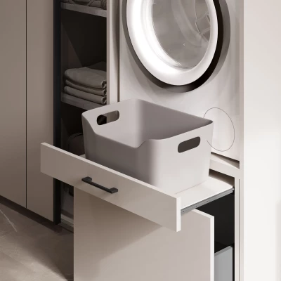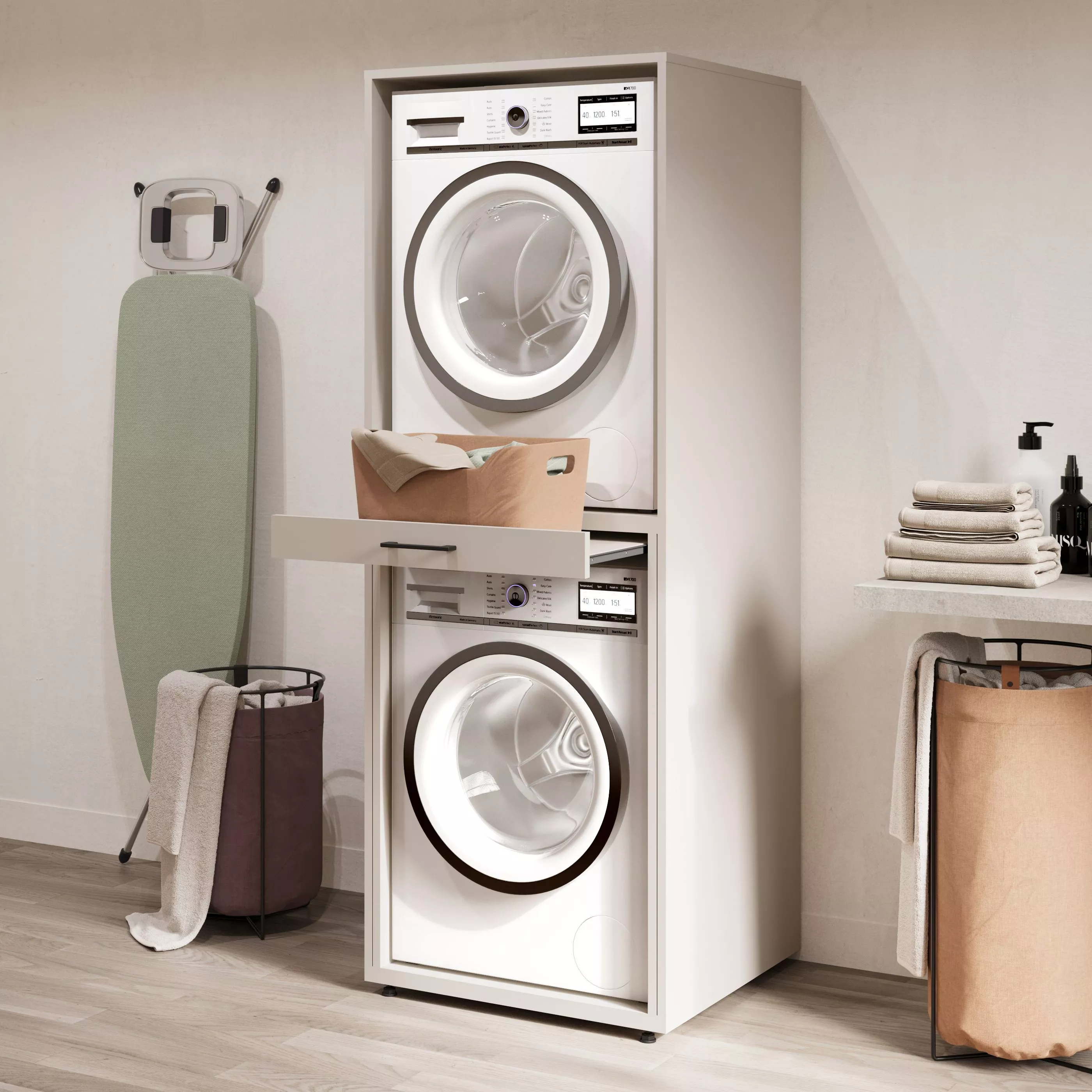Skříňka na pračku a sušičku BRIANAH bude ideálním řešením do všech moderních koupelen. Disponuje navíc i výsuvnou policí pro odložení koše na prádlo.