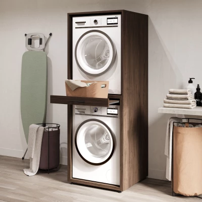 Skříňka na pračku a sušičku BRIANAH bude ideálním řešením do všech moderních koupelen. Disponuje navíc i výsuvnou policí pro odložení koše na prádlo.