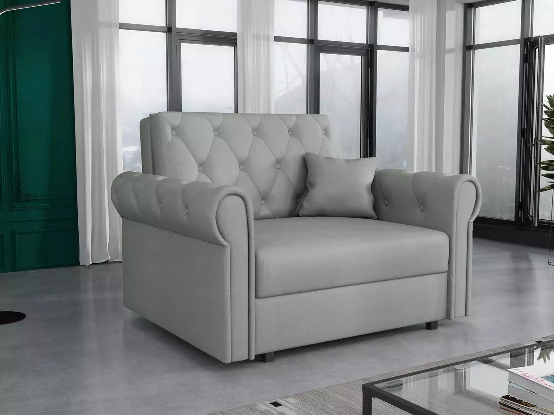 Rozkládací křeslo RAMFA je perfektní volbou pro moderní interiéry, které touží po sofistikovaném vzhledu. Krásné barvy a ozdobné prošívání mu dodávají jedinečný charakter, který oživí váš pokoj. Kromě atraktivního designu nabízí i praktické funkce – snadno jej přeměníte na pohodlné lůžko o rozměrech 80x196 cm a využijete úložný prostor pro uschování věcí.