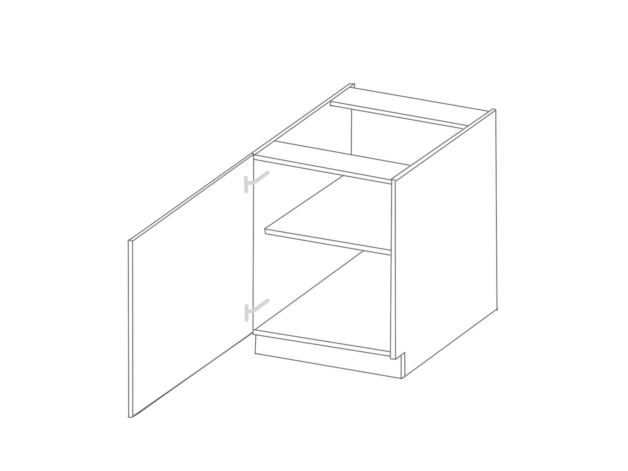 Moderní spodní kuchyňská skříňka, jejíž design kombinuje desku ve vysokém lesku s deskou v dekoru dub artisan. Sokl a panty s tichým dovíráním jsou v ceně.