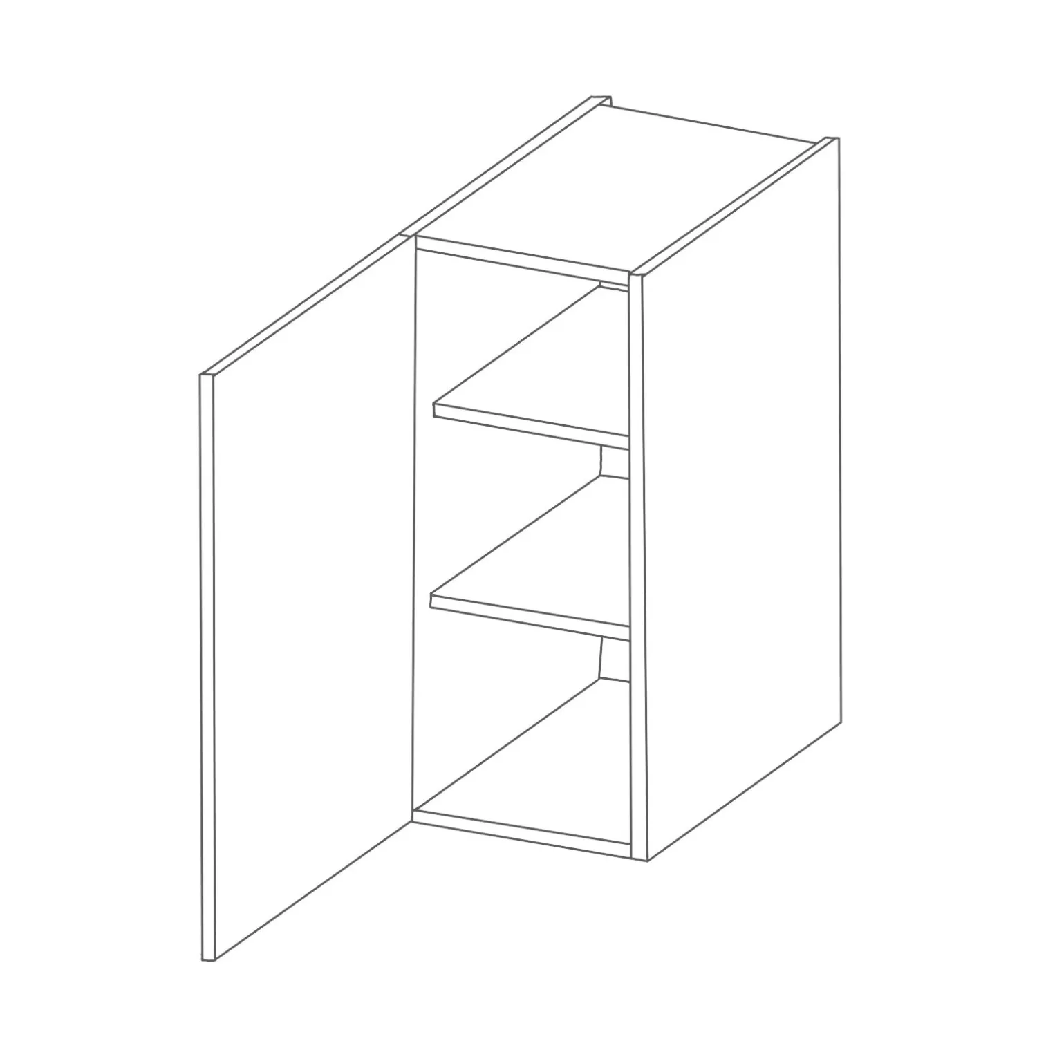 Horní kuchyňská skříňka s kompaktními rozměry je často umísťována hned vedle zavěšené rohové skříňky. Korpus je vyroben z desky v odstínu dub artisan, uvnitř je v matné bílé barvě a obsahuje dvě police. Dvířka jsou ke korpusu připevněna pomocí pantů s tichým zavíráním.