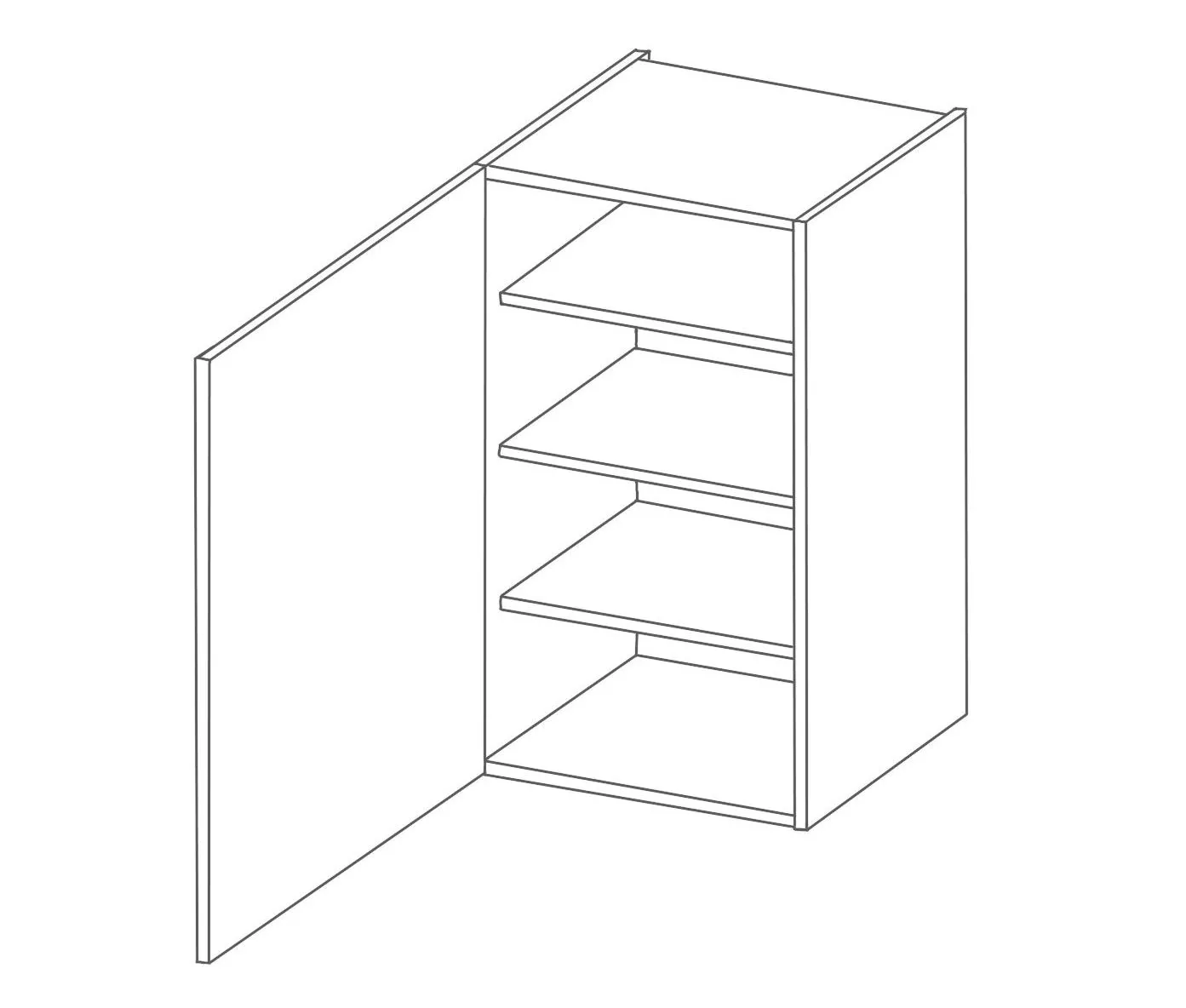Funkční závěsná skříňka je vybavena tichým dovíráním. Dvířka jsou vyrobena z desky ve vysokém lesku a korpus v dekoru dub artisan. Uvnitř skříňky jsou umístěny tři police v matné bílé barvě.