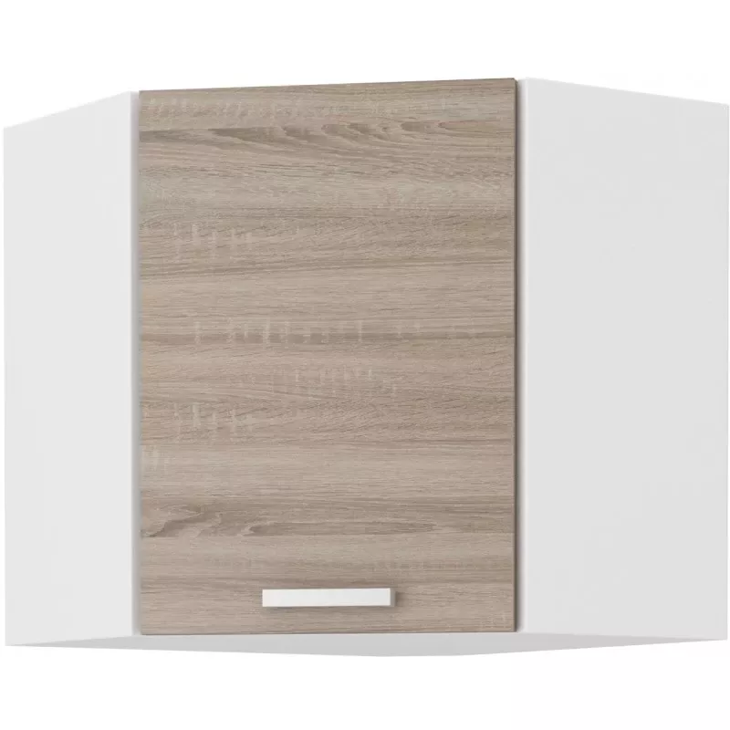 Kuchyňské skříňky SABRYA zahřejí u srdce. Toto je nabídka pro lidi, kteří milují přirozený vzhled. Dekor dřeva dodává místnosti útulnou atmosféru. Máte kuchyň ve tvaru L a potřebujete funkční rohový kus nábytku? Na to je skvělá rohová závěsná skříňka. Korpus skříňky je v bílé barvě. Je ideální pro skladování kuchyňských potřeb. Úchyty umožňují pohodlné používání skříňky.