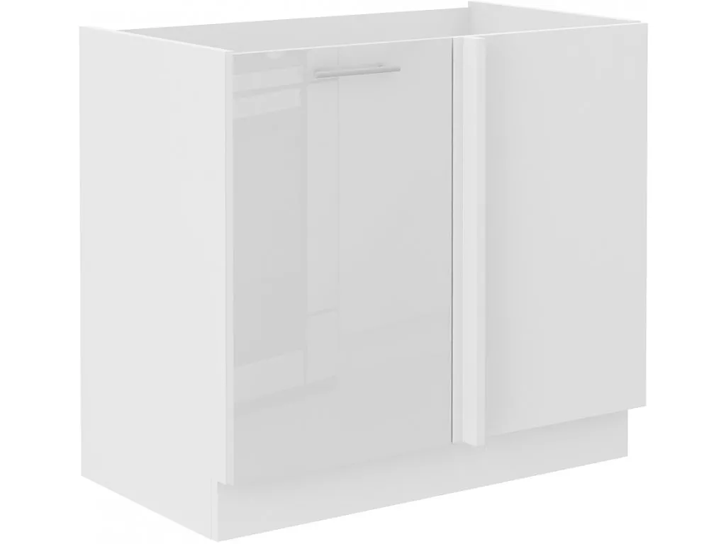 Rohová skříňka ze série LAJLA má lesklá dvířka s kovovým úchytem. Korpus je v bílé barvě a nabízí jednu polici, která skříňku dělí na dvě části.