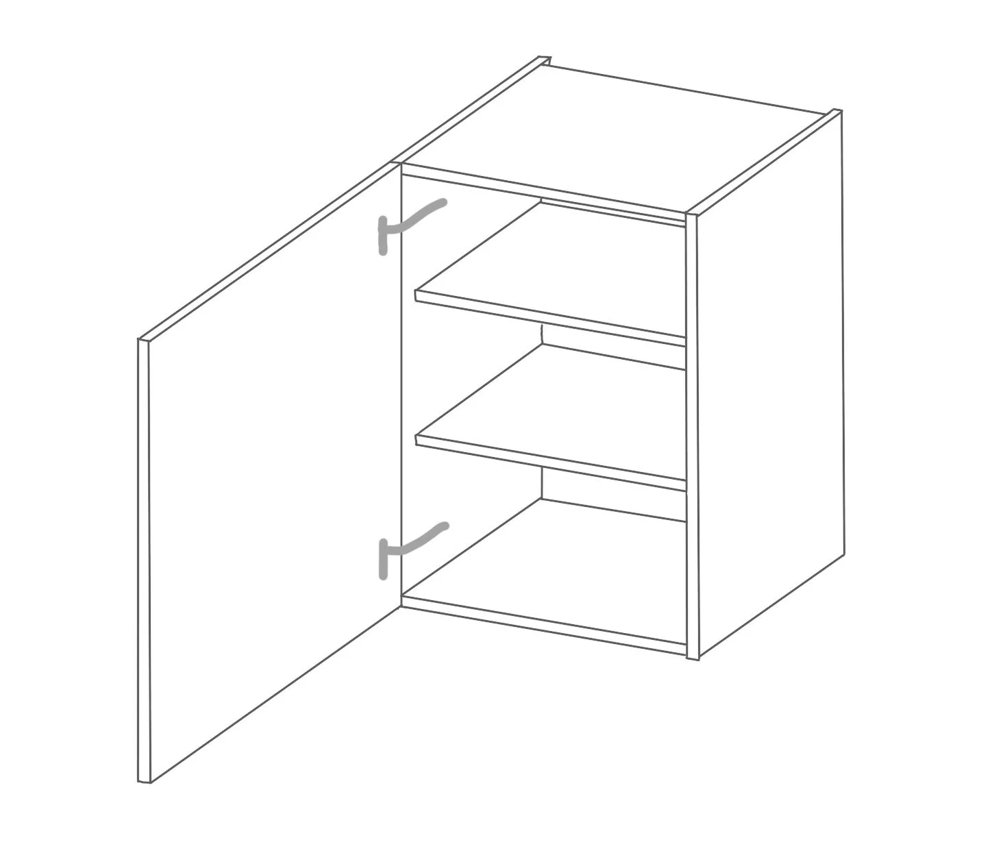 Závěsná kuchyňská skříňka s lesklými dvířky je vybavena policemi. Dvířka disponují decentním kovovým úchytem. Zadní stranu zpevňuje deska s omyvatelnou vnitřní stranou.