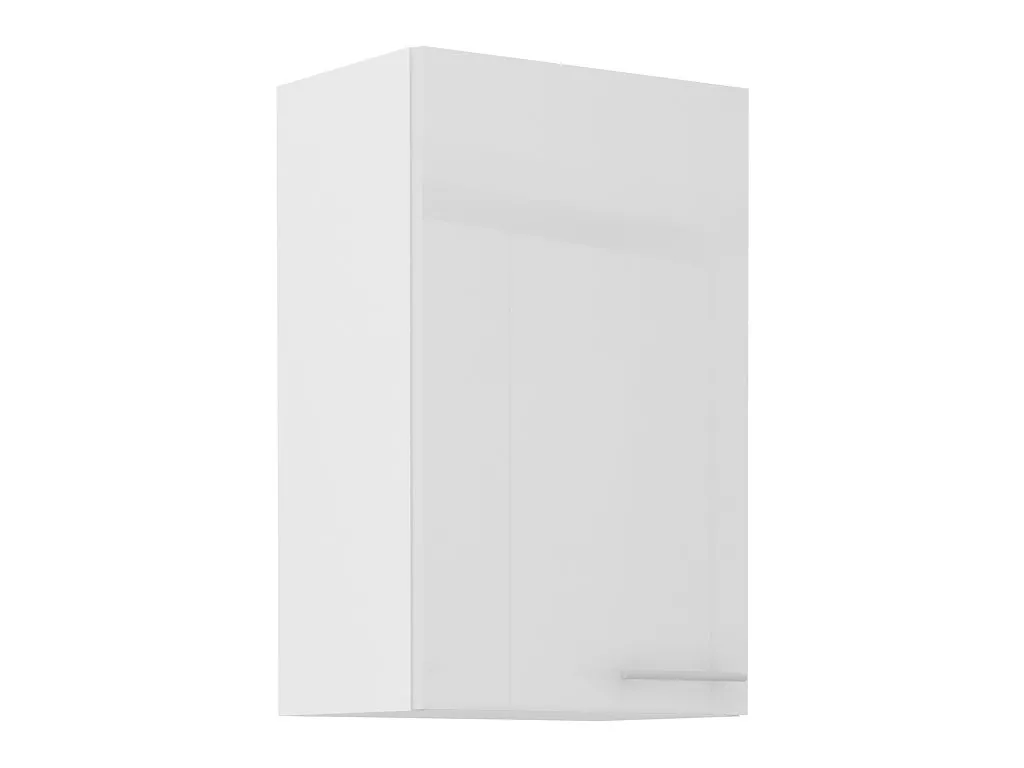 Závěsná kuchyňská skříňka s lesklými dvířky je vybavena policemi. Dvířka disponují decentním kovovým úchytem. Zadní stranu zpevňuje deska s omyvatelnou vnitřní stranou.