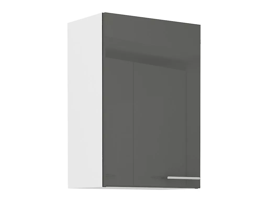 Závěsná kuchyňská skříňka s lesklými dvířky je vybavena policemi. Dvířka disponují decentním kovovým úchytem. Zadní stranu zpevňuje deska s omyvatelnou vnitřní stranou.
